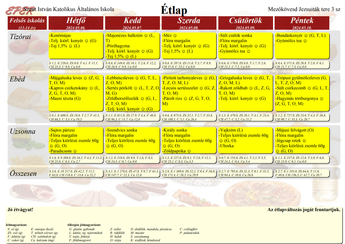 Kérjük az étkezési ill. elviteli szándékot hét elején, lehetőleg hétfőn jelezni, mert előfordulhat, hogy a későn leadott igényeket már nem tudjuk teljesíteni. Az étkezést az adott napon reggel 8:00-ig lehet lemondani.