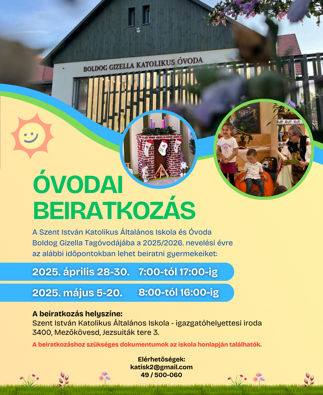 A Szent István Katolikus Általános Iskola és Óvoda Boldog Gizella Tagóvodájába a 2025/2026. nevelési évre az alábbi időpontokban lehet beíratni gyermekeiket: