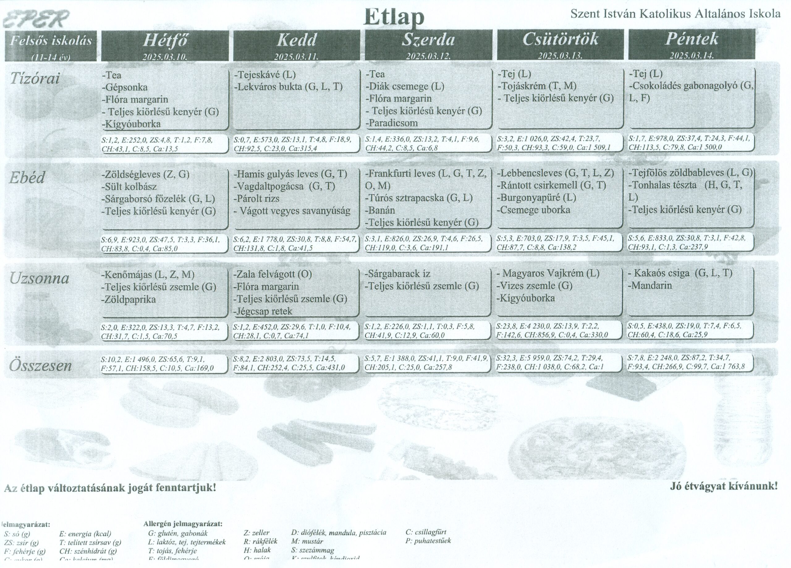2024. szeptember 1-től a Szent István Katolikus Általános Iskola étkezési térítési díjai: