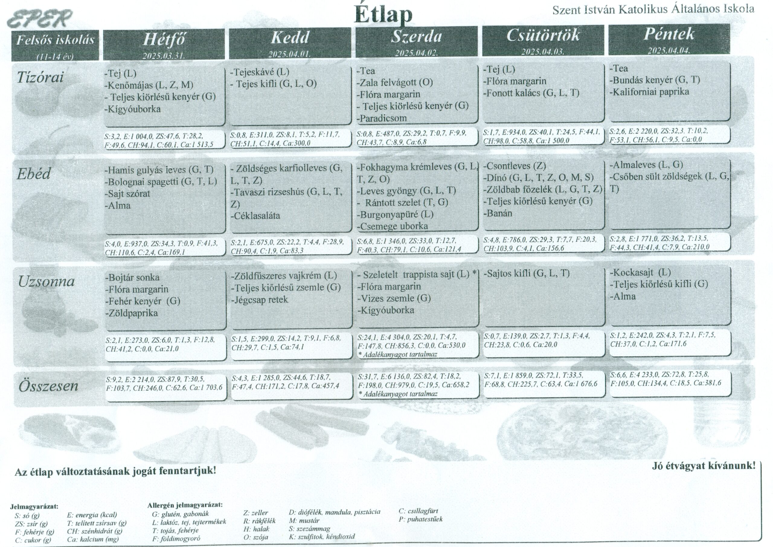 2024. szeptember 1-től a Szent István Katolikus Általános Iskola étkezési térítési díjai: