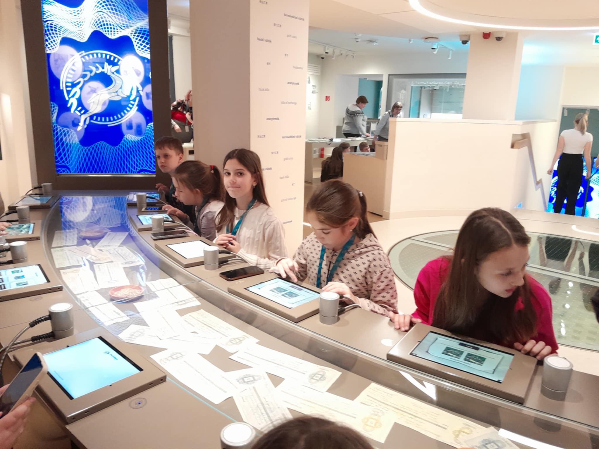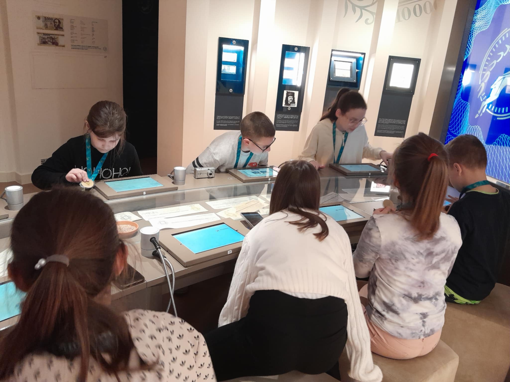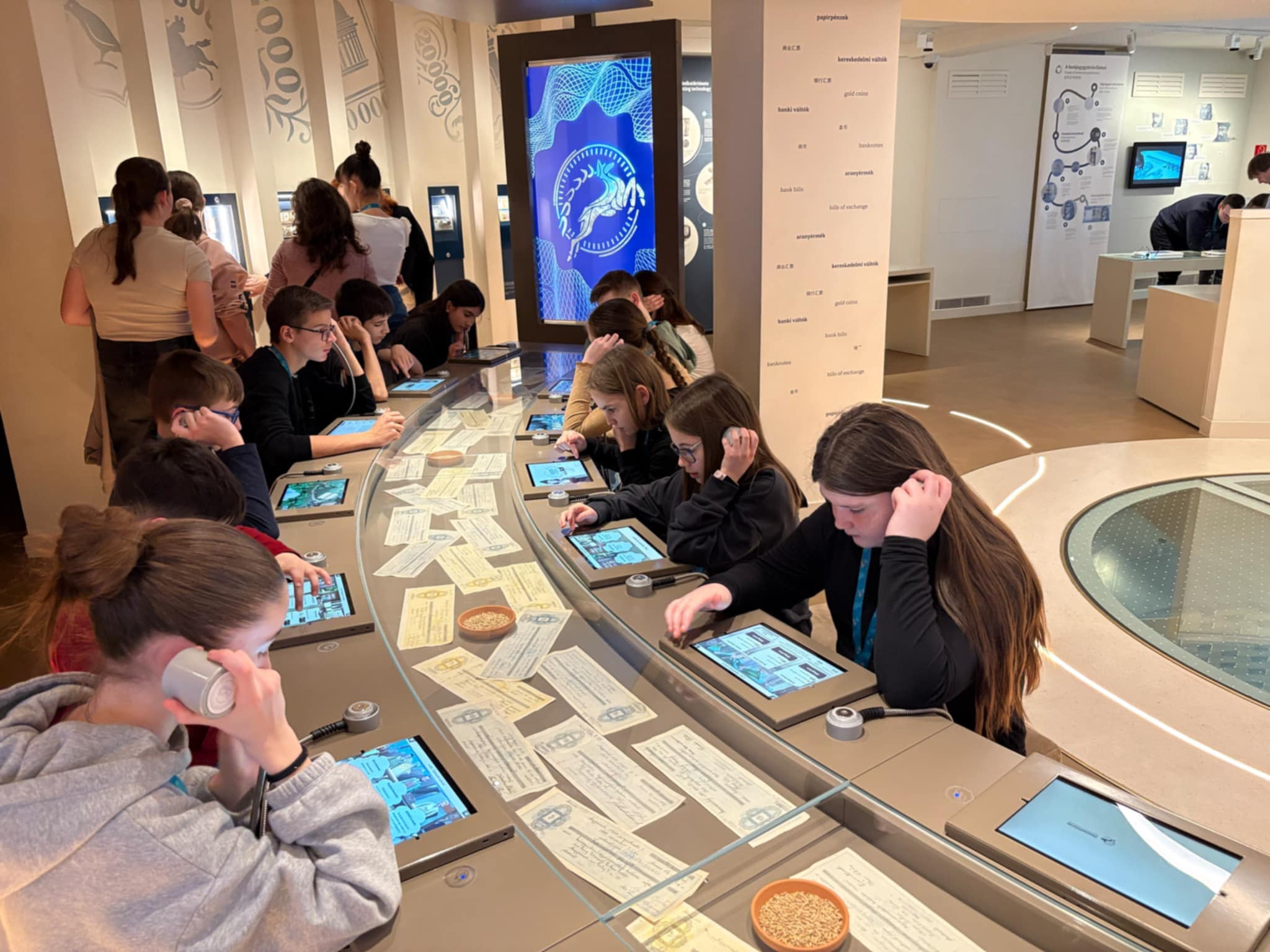 A Pénzmúzeumban a gyerekek két csoportba rendeződtek, így az azonos korosztályú diákok külön-külön élvezhették a különféle programokat. A múzeumban az állandó kiállítások mellett, különféle aktuális témákat feldolgozó állomásokon próbálhatták ki magukat a gyerekek. Az aktuális kiállítás, melyen a csoportunk is részt vett a pénz útja nevet viseli. Az ingyenesen megtekinthető kiállítás első állomása az aranybánya, ahol a nemesfém bányászathoz használt eszközökkel ismerkedhettünk meg. A következő állomáson a pénz bevezetése előtt használt értékmérőket, mint fizetőeszközöket csodáltuk meg pl. kagyló, só, menyét. Ezek után a pénz formai változásait figyelhettük, hogyan változott történelmünk során, egészen Károly Róberttől napjainkig. Majd a bankok fontossága következett, illetve annak bemutatása milyen lenne bank nélkül az élet. A negyedik állomáson a tőzsdét mutatták be, a gyerekek megtudhatták mit jelképez a medve, illetve a bika a tőzsdén. Az utolsó állomáson különféle kincseket tekinthettünk meg és súlyemelésként egy 400 millió forint értékű aranytömböt is megpróbálhattunk felemelni, de különös élmény volt a robottal való társalgás is.