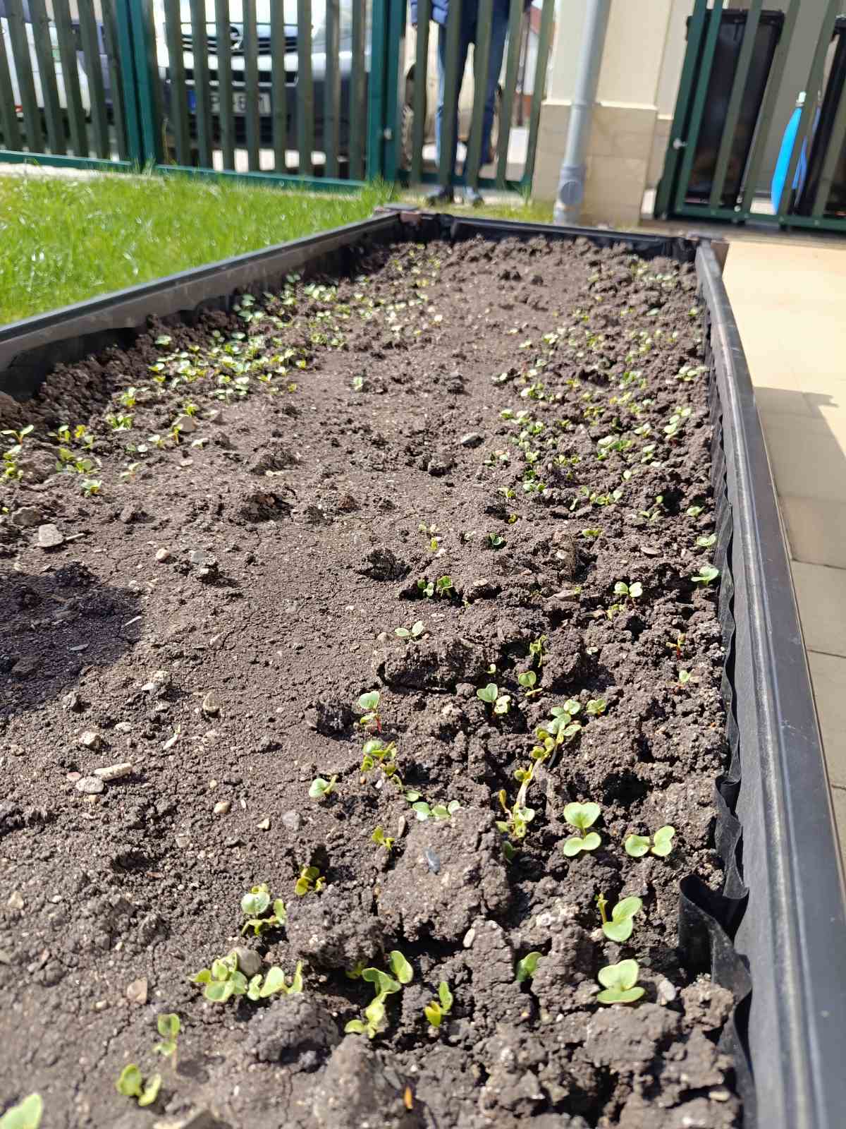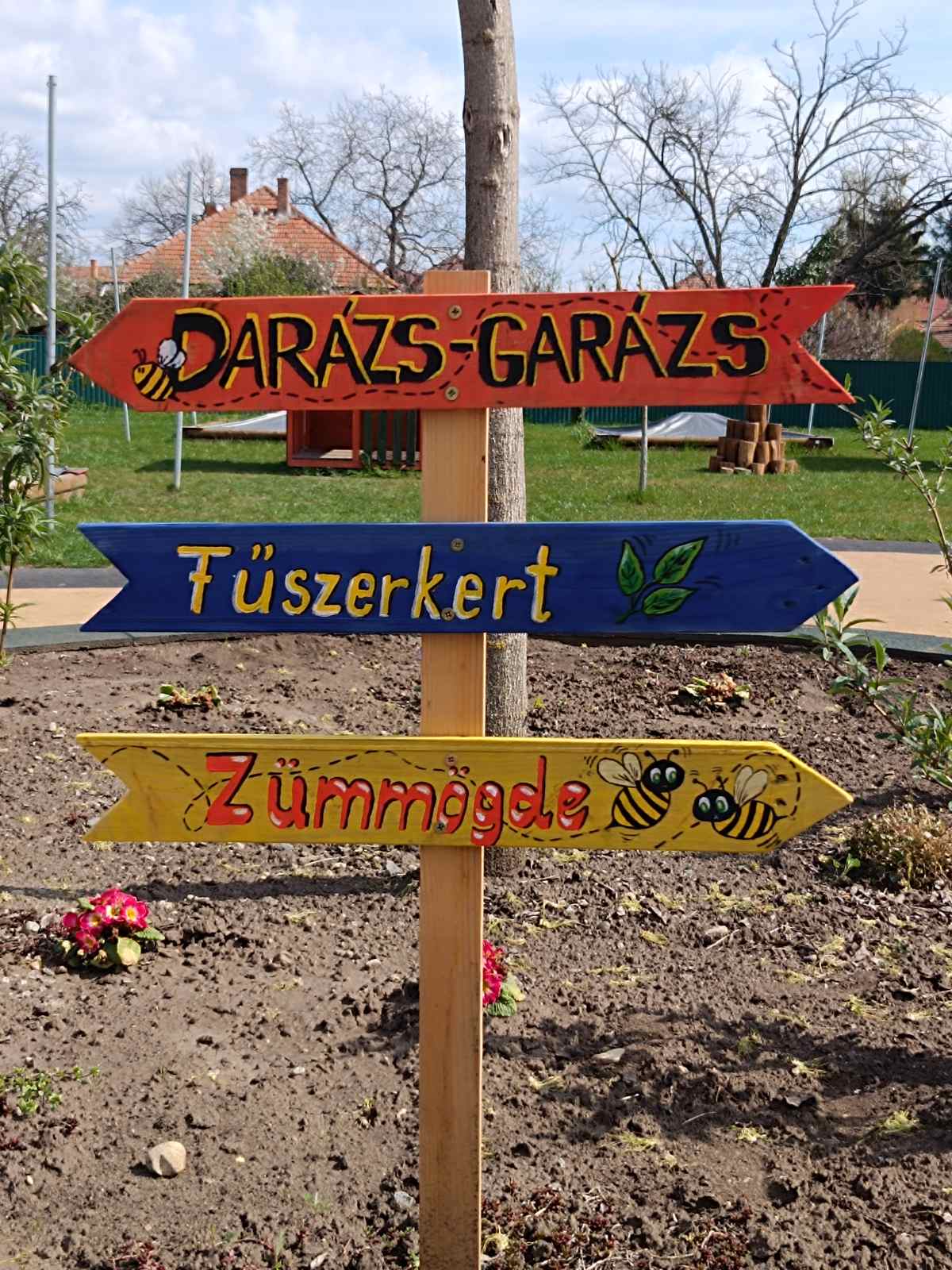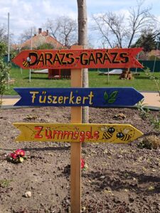 A Boldog Gizella Óvoda magaságyásaiban kikeltek az elültetett retek és zöldhagyma magvak. A gyerekekkel közösen elkészítettük a rovarhoteleket is. Iránymutató táblákat mutatják a fűszerkert, a darázs-garázs helyét.