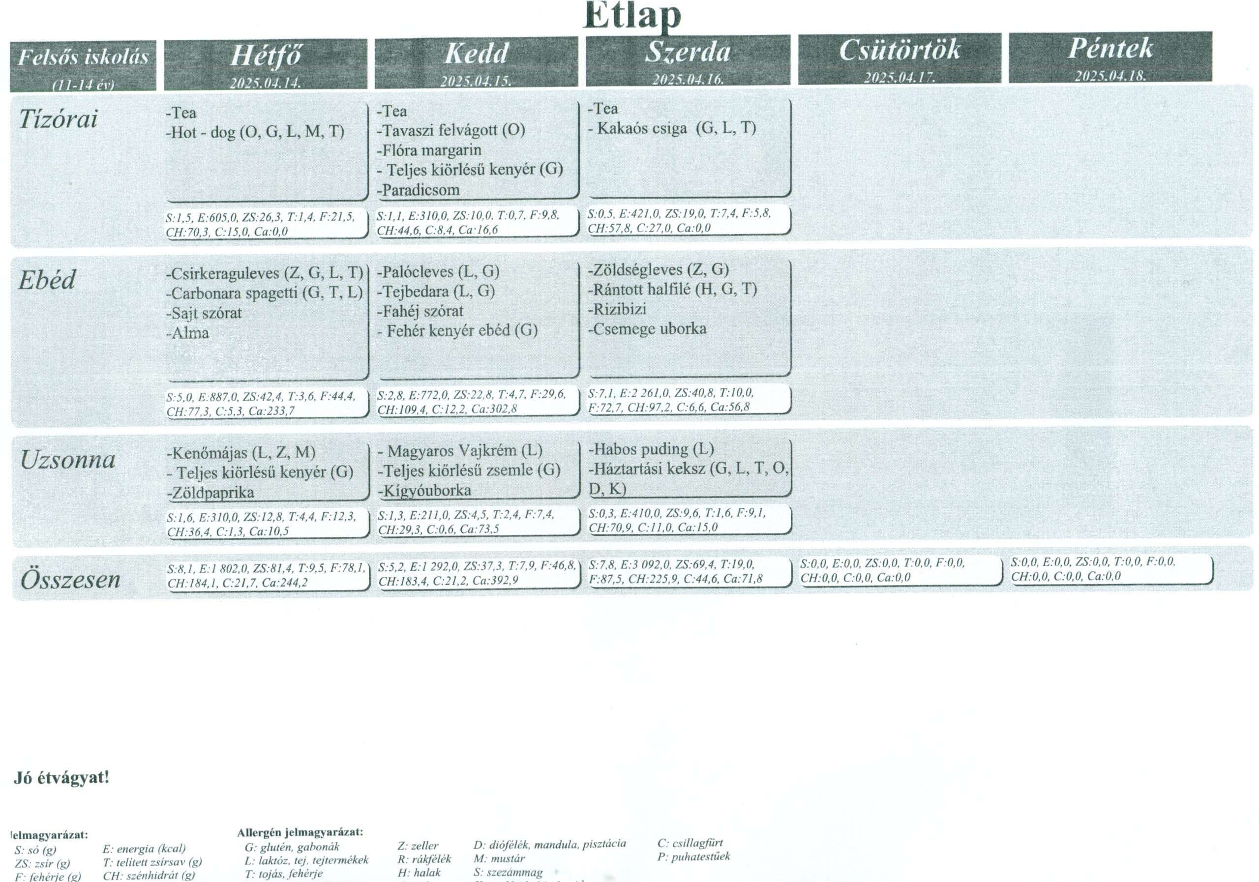 Az ételek allergén összetevőket tartalmazhatnak /glutén, tojás, szója, tej, diófélék, zeller, mustár, hal, szezámmag/