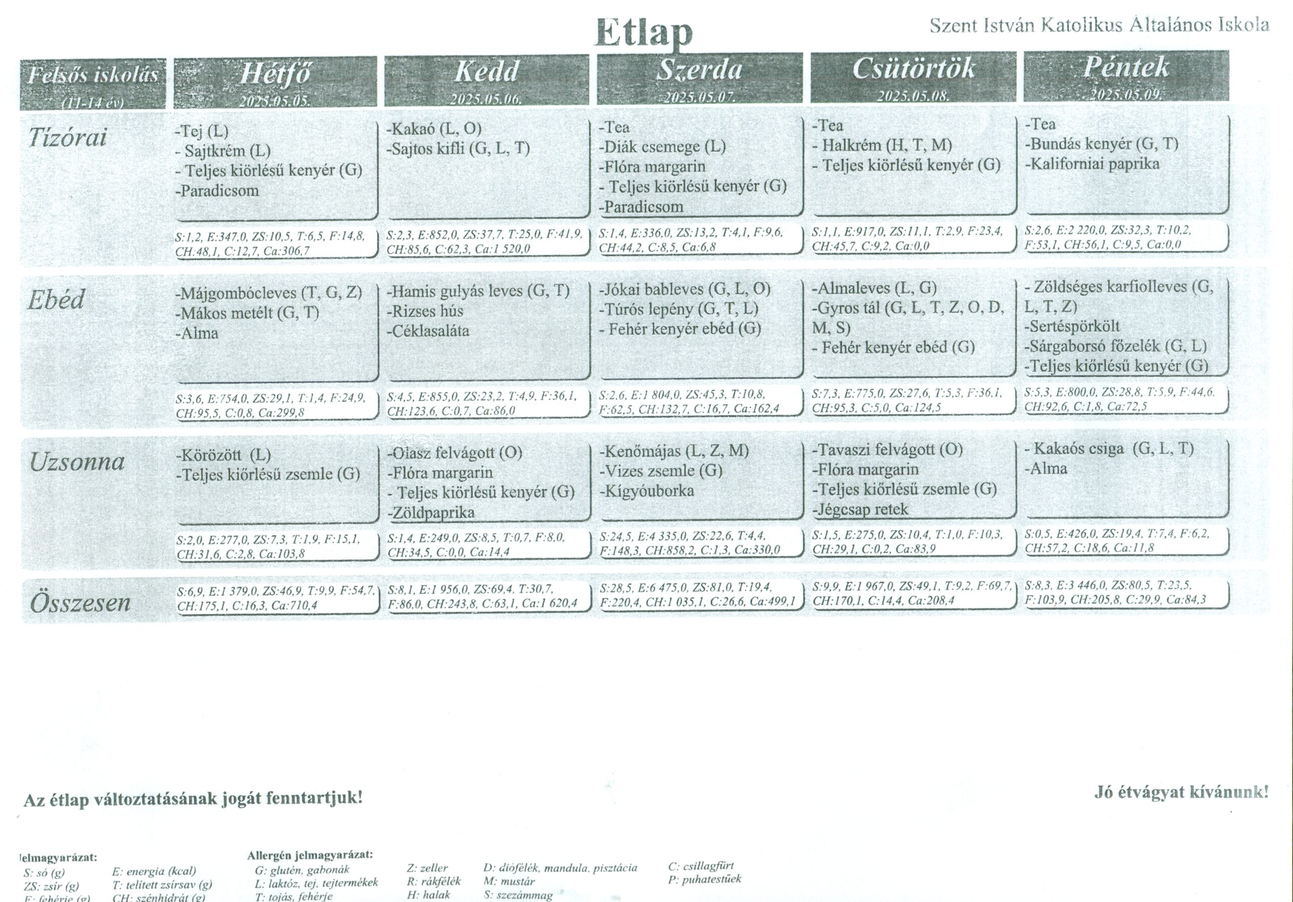 2024. szeptember 1-től a Szent István Katolikus Általános Iskola étkezési térítési díjai:
