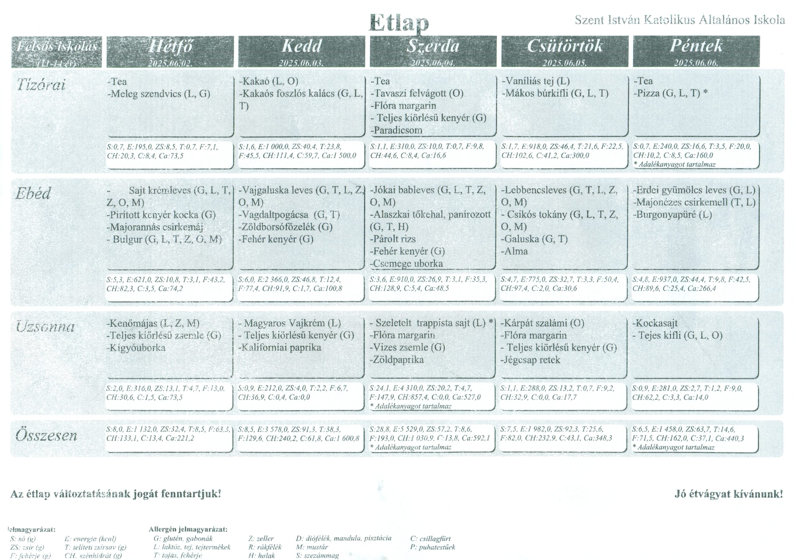 2024. szeptember 1-től a Szent István Katolikus Általános Iskola étkezési térítési díjai:
