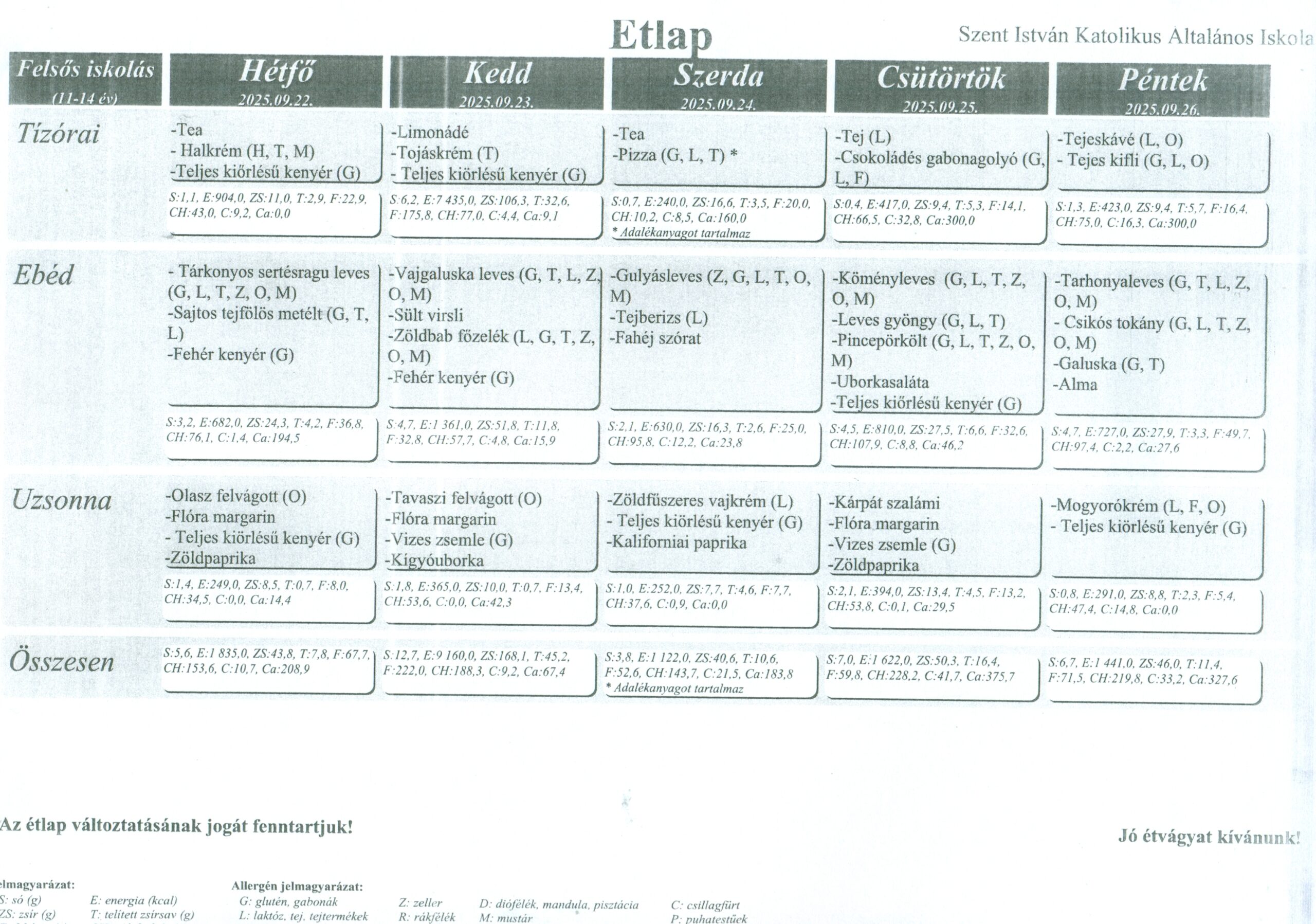 2024. szeptember 1-től a Szent István Katolikus Általános Iskola étkezési térítési díjai: