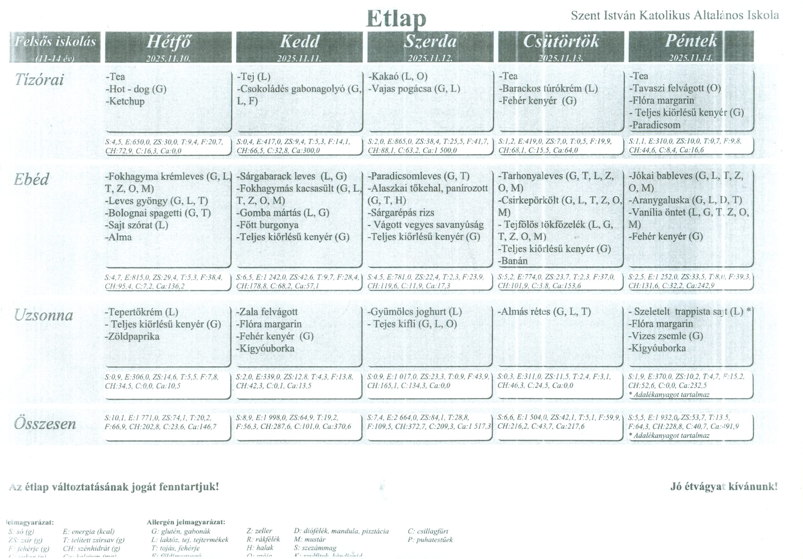 2024. szeptember 1-től a Szent István Katolikus Általános Iskola étkezési térítési díjai:
