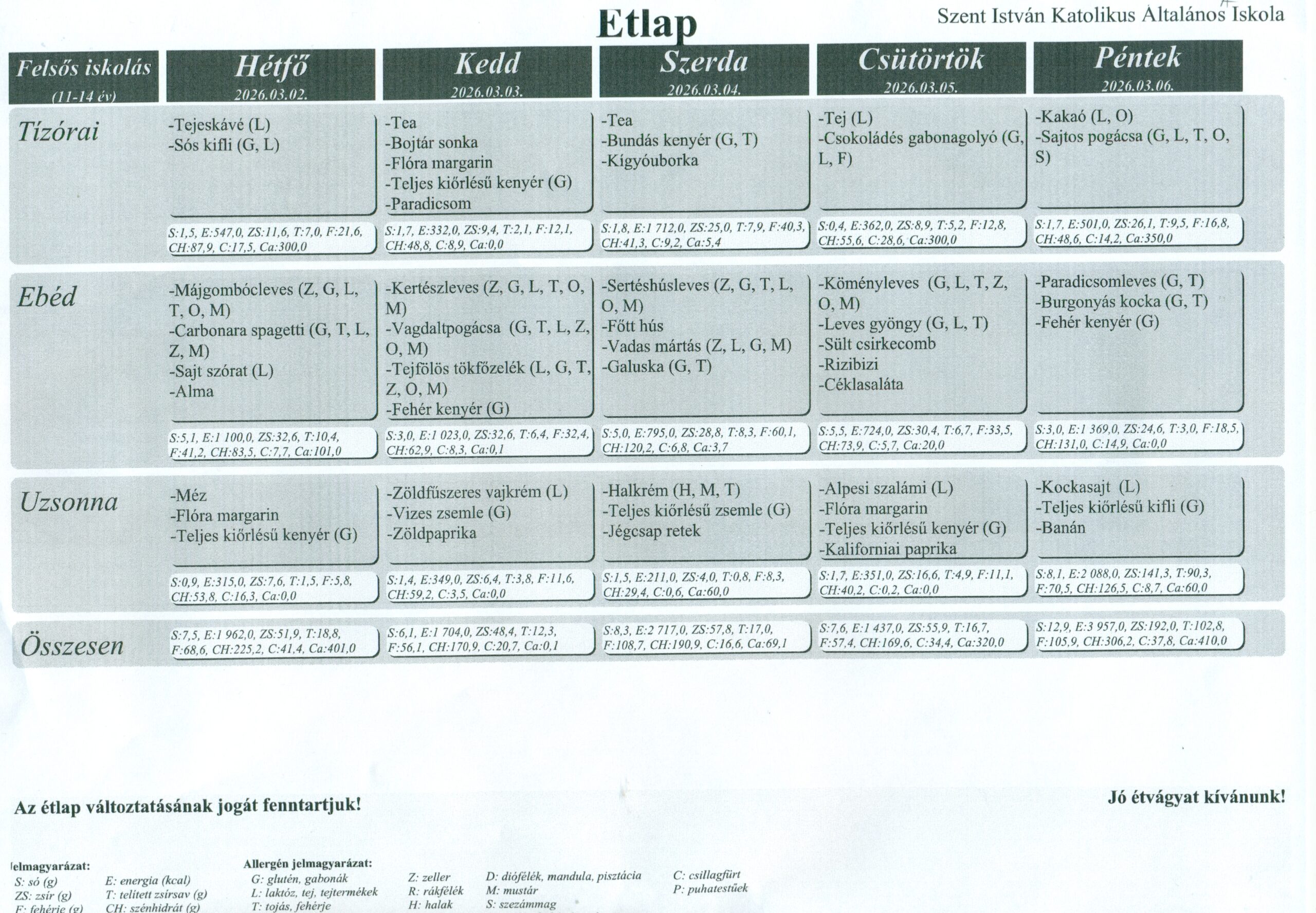 2024. szeptember 1-től a Szent István Katolikus Általános Iskola étkezési térítési díjai: