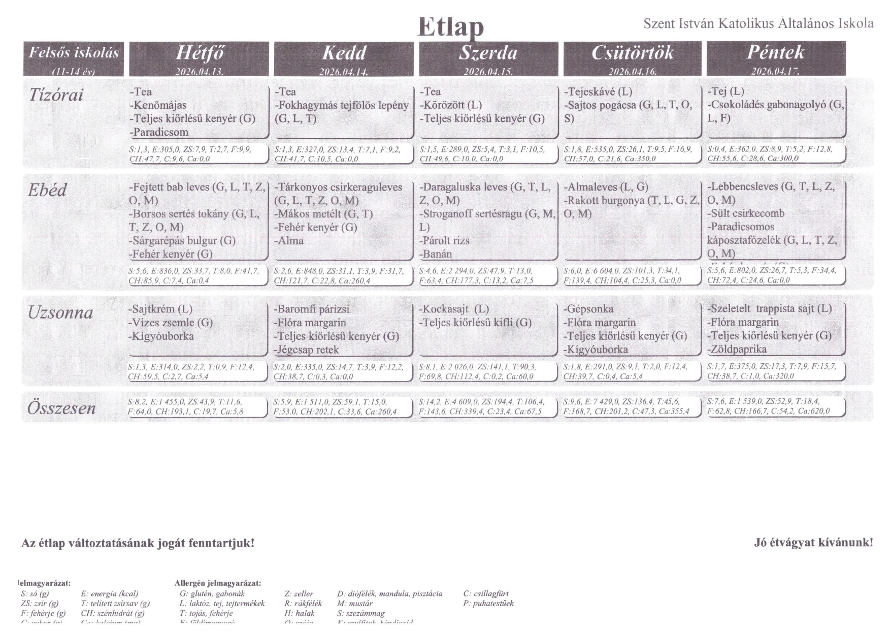 2024. szeptember 1-től a Szent István Katolikus Általános Iskola étkezési térítési díjai: