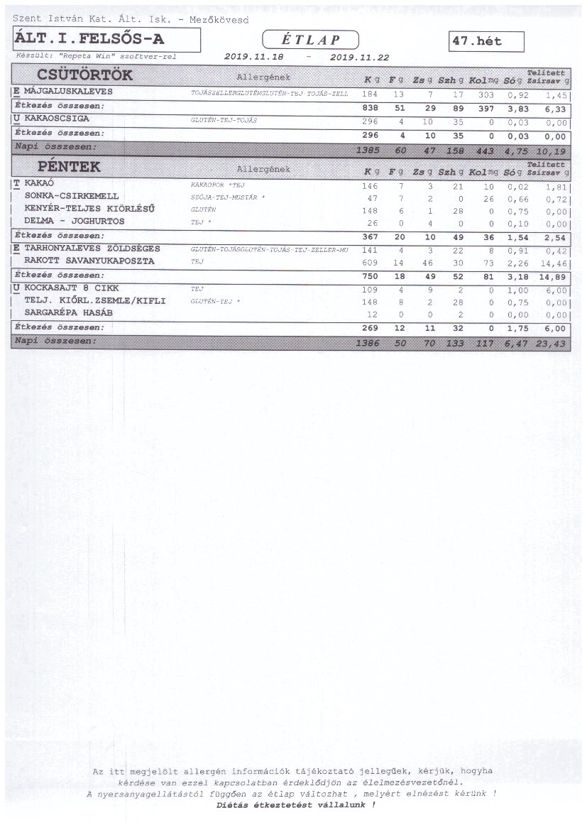 Kérjük az étkezési ill. elviteli szándékot hét elején, lehetőleg hétfőn jelezni, mert előfordulhat, hogy a későn leadott igényeket már nem tudjuk teljesíteni. Az étkezést az adott napon reggel 8:00-ig lehet lemondani.