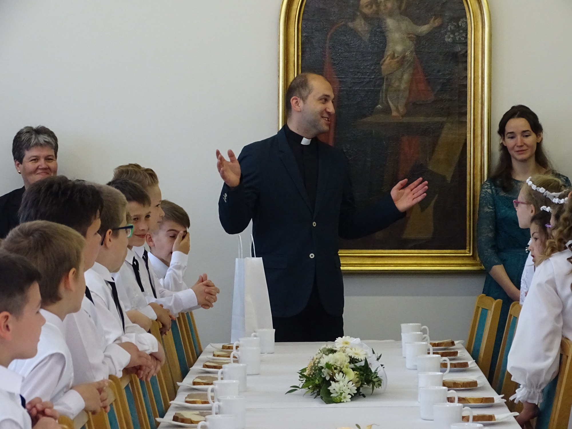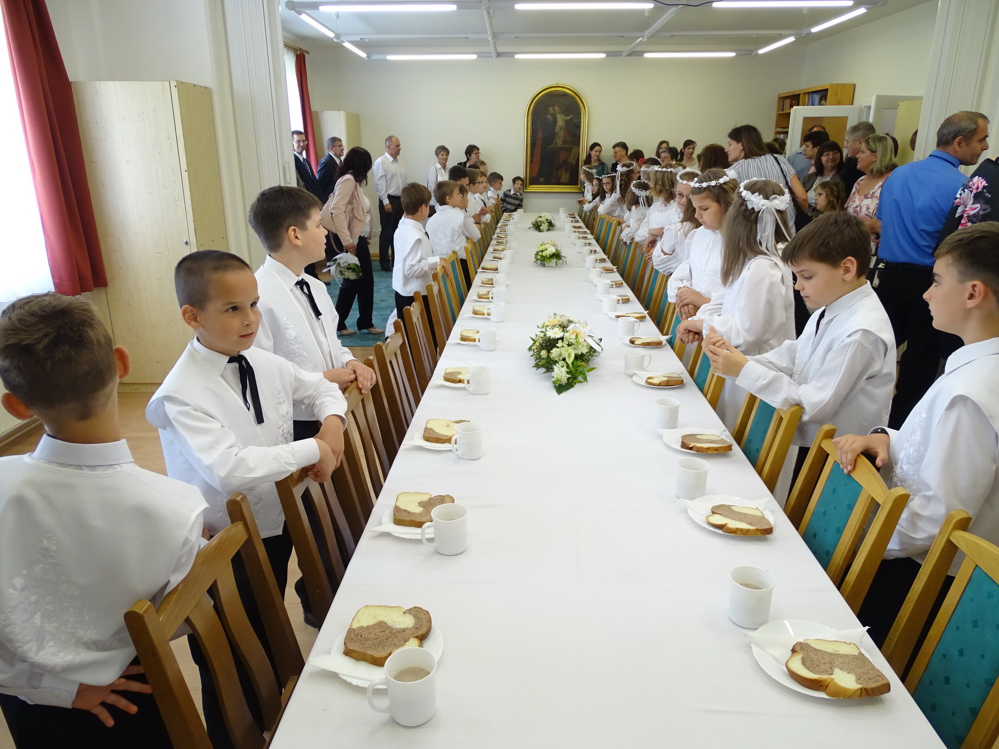 Ahogy az eddigi alkalmakon megszokhattuk most is a meséhez kapcsolódó dekoráció (sakktábla, kalap, varázspálca) fogadta az ebédlőbe érkezőket, a szépen terített asztalon finom falatok mellett a nyiladozó tavasz jelképei (nárcisz csokor, húsvéti tojás) is helyet kaptak.