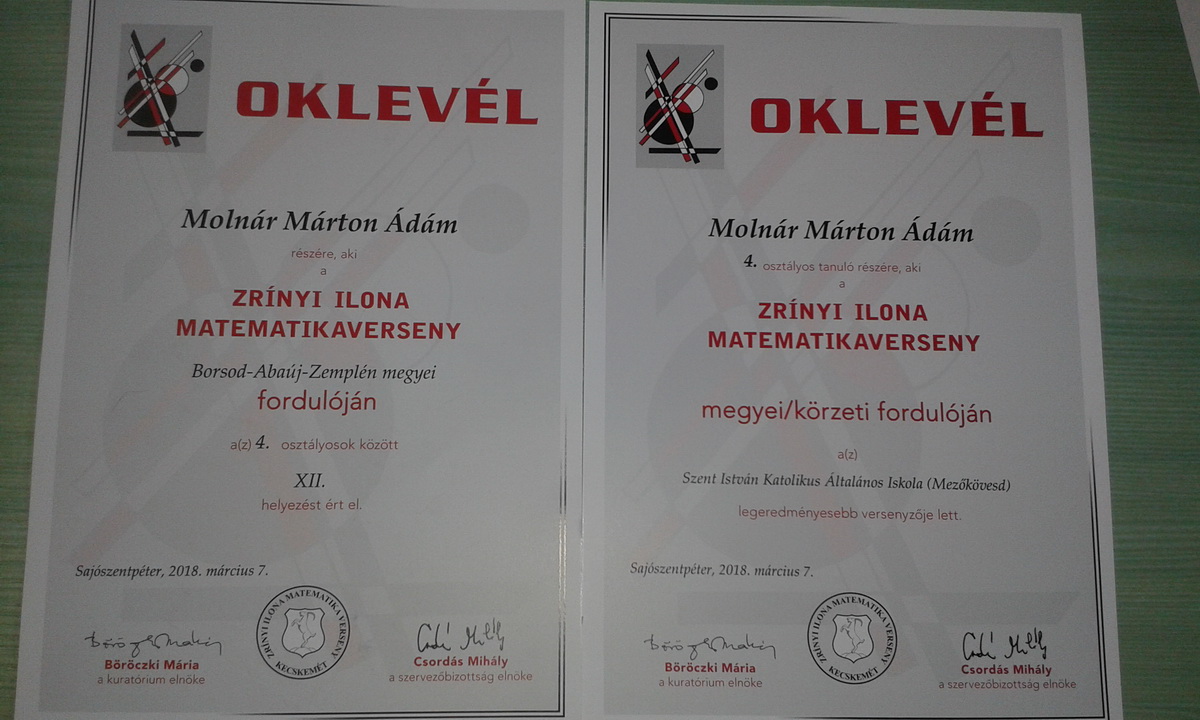 3. osztályosok: Roszkos András Milán kiemelt 1. helyezés