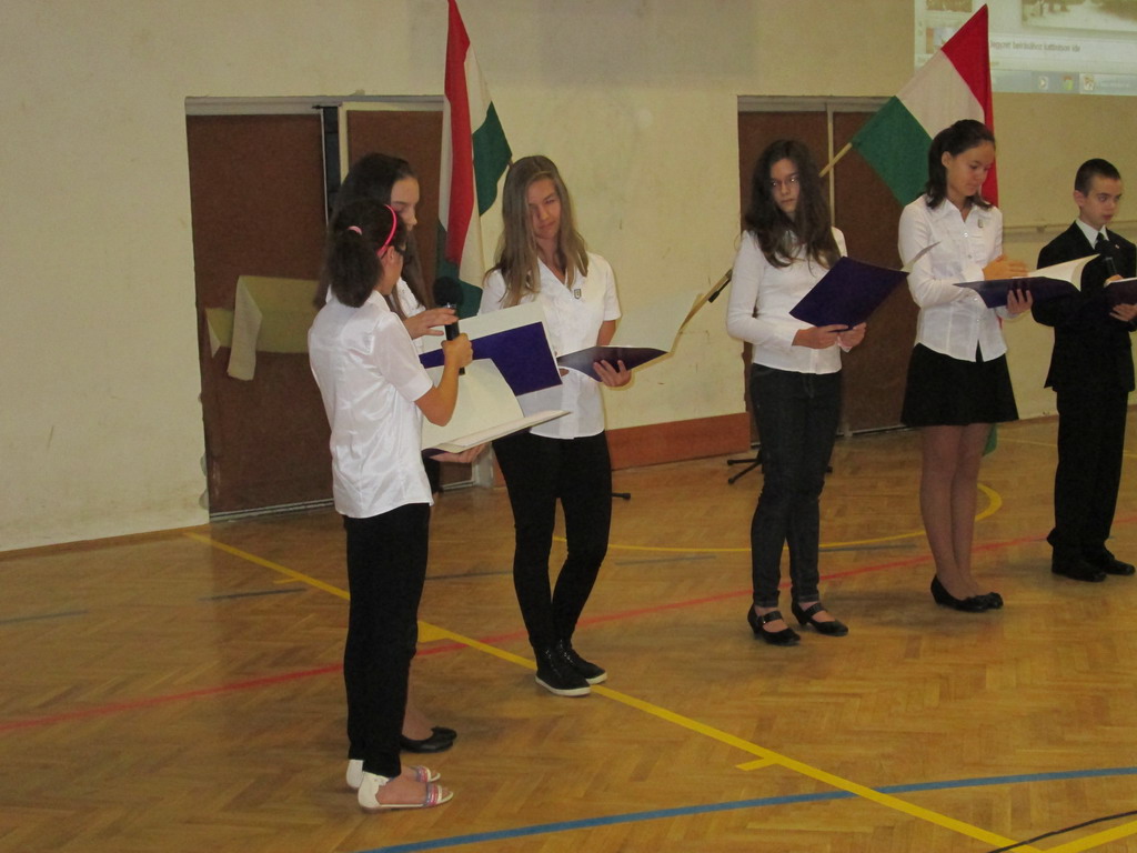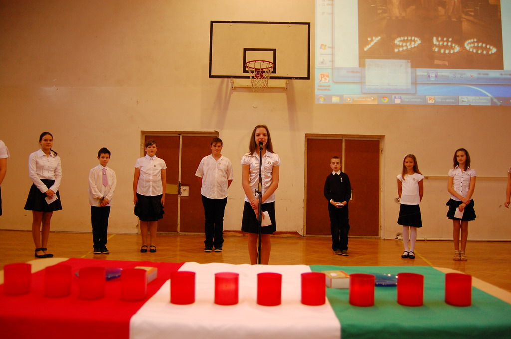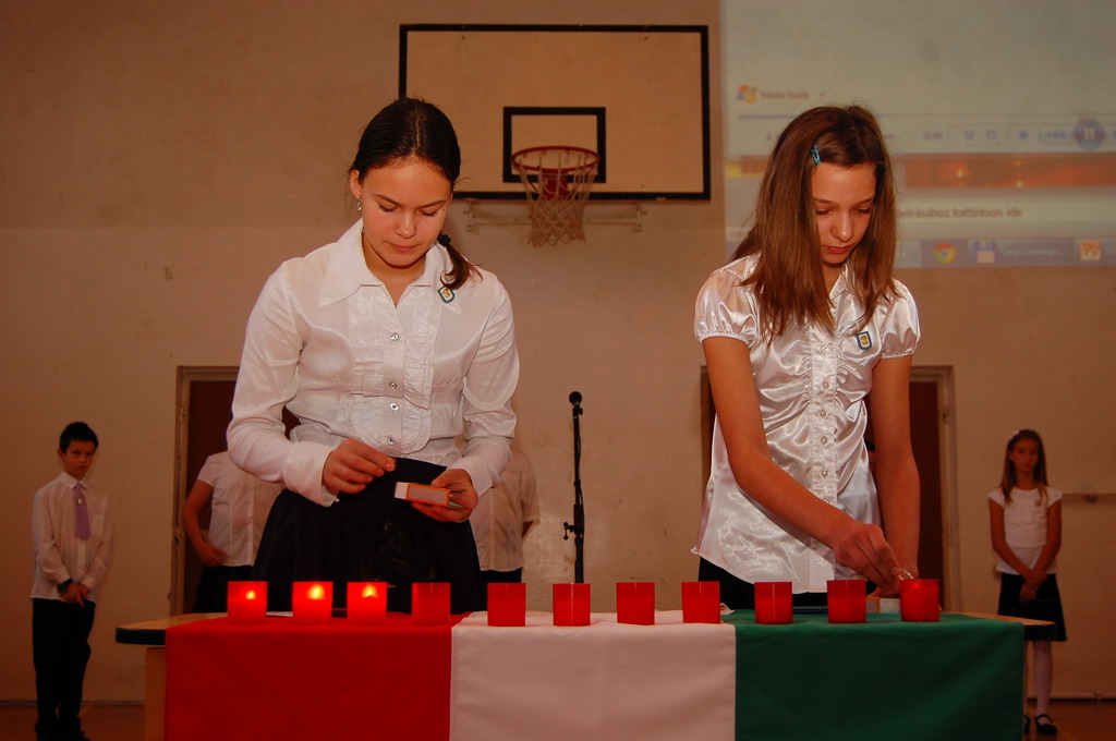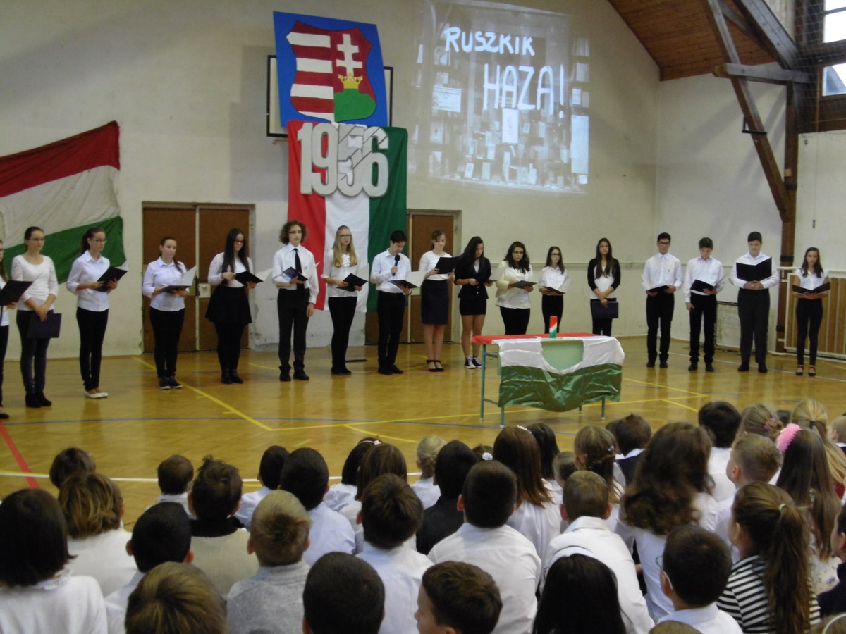 2013. október 22-én reggel iskolakezdéskor (8 óra) iskolánk tornatermében emlékeztünk 1956-ra. A műsort a 6.b osztály tanulói adták elő, akiket Jacsóné Molnár Gyöngyi tanárnő készített fel. A műsort a korról szóló videók színesítették.