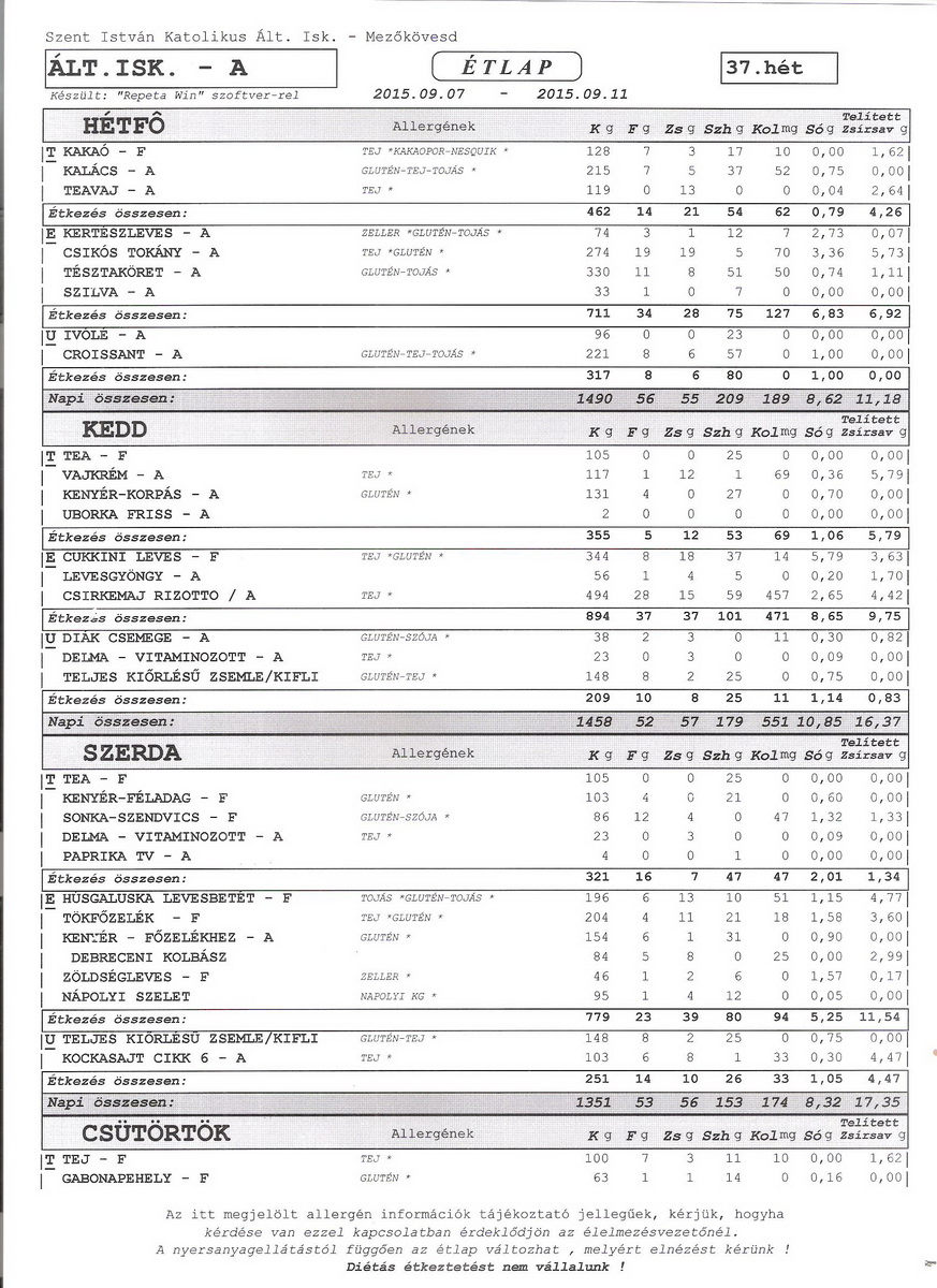 A Szent István Katolikus Általános Iskola 2015/2016-os tanévének rendje
