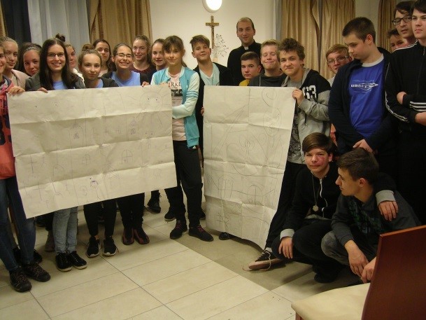 A Szent István Általános Katolikus Iskola emeleti könyvtárterme meleg otthonossággal fogadott – az előkészített színes kártyák, zsírkréták, táblák – pedig kreatív feladatokat sejtettek. Gyertyaláng és kéz a kézben elmondott Miatyánk indította egymásra hangolódásunkat, közös utunkat.