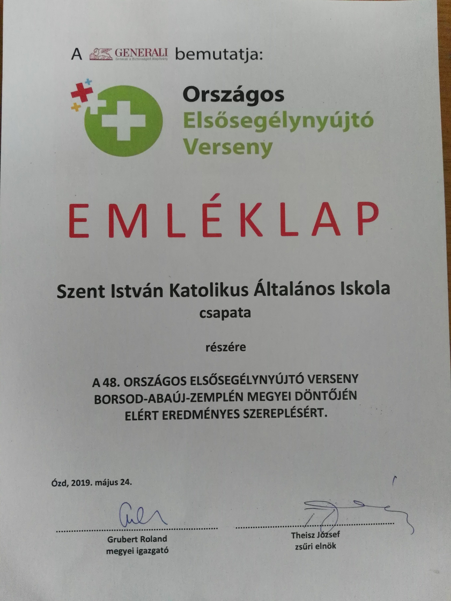 A 48. Országos Elsősegélynyújtó Verseny Borsod-Abaúj-Zemplén megyei döntőjén, 2019. május 24-én a Szent István Katolikus Általános Iskola csapata eredményesen szerepelt.