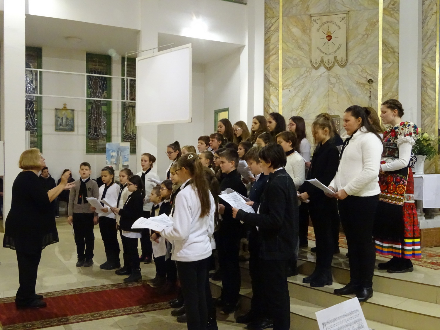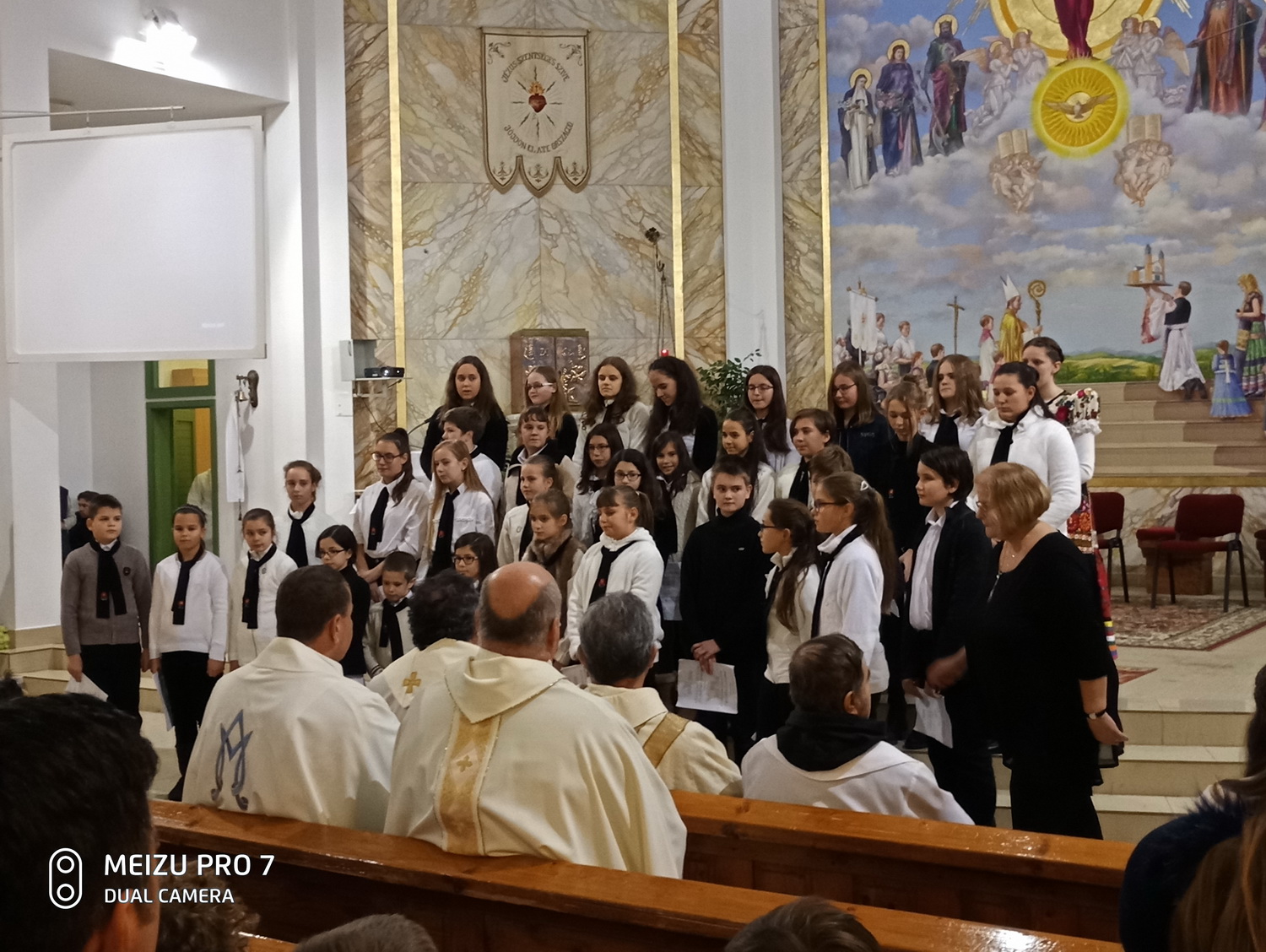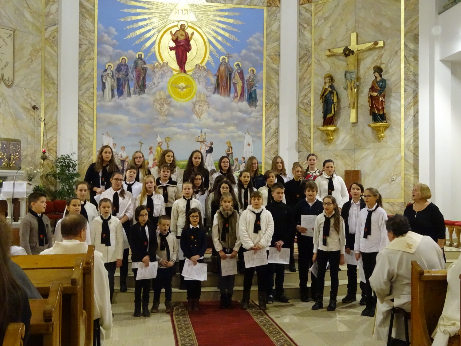 November 25-én a Jézus Szíve templomban az esti szentmise előtt rövid zenés áhítatban tisztelegtünk Szent Cecília, a zene védőszentje előtt. Két orgonaszám között dalolt iskolánk énekkara. Egyszólamú, kánon, és többszólamú egyházi művek csendültek fel ajkukon Kovácsné Együd Ilona tanárnő vezetésével. Zongorán kísért Patainé Péter-Szarka Éva tanárnő és Kovács Blanka 7.a osztályos tanuló.