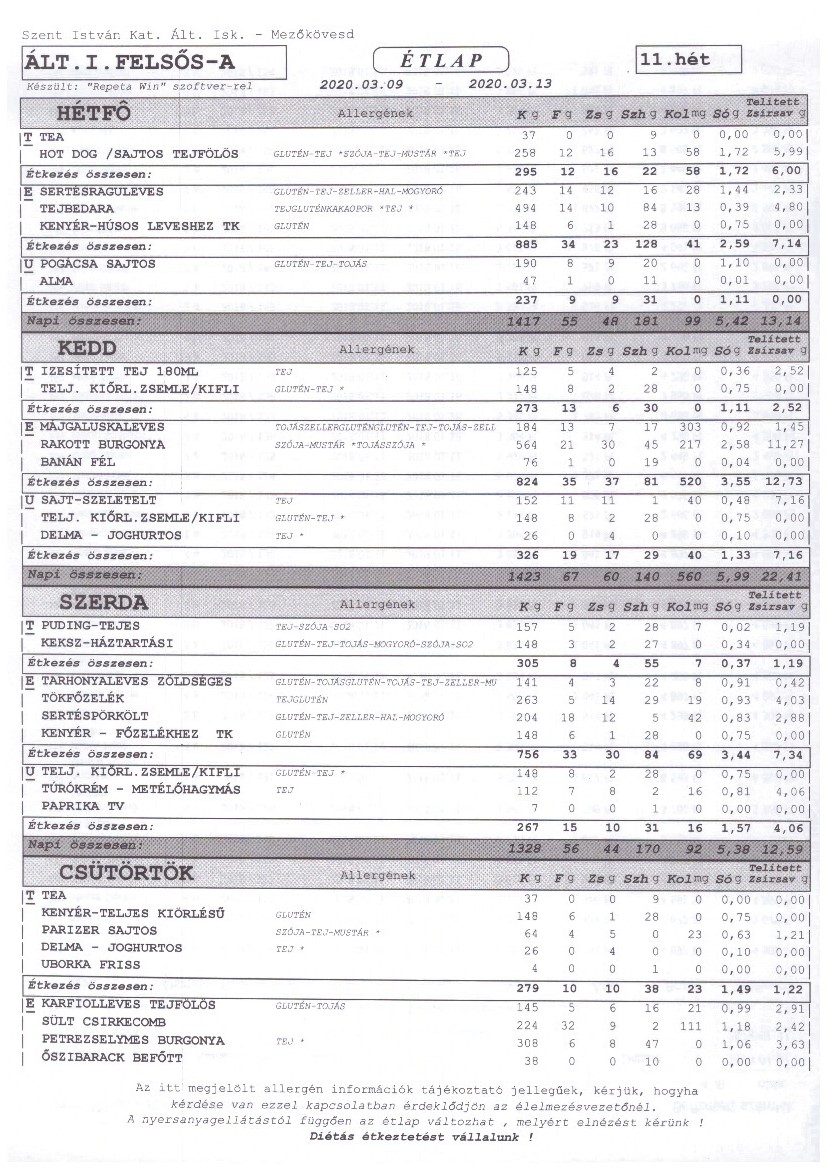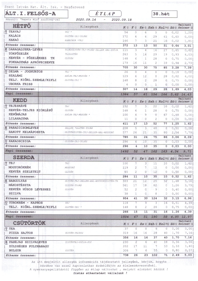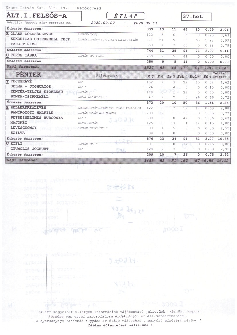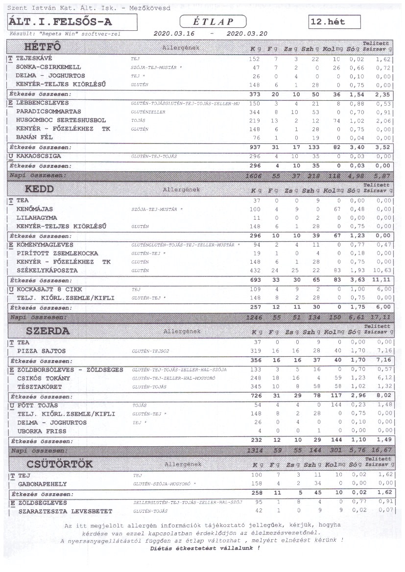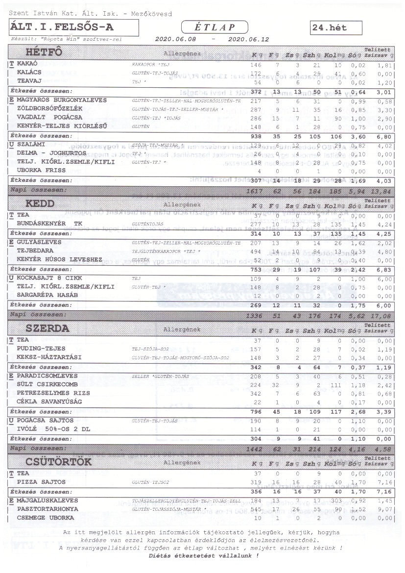 Kérjük az étkezési ill. elviteli szándékot hét elején, lehetőleg hétfőn jelezni, mert előfordulhat, hogy a későn leadott igényeket már nem tudjuk teljesíteni. Az étkezést az adott napon reggel 8:00-ig lehet lemondani.