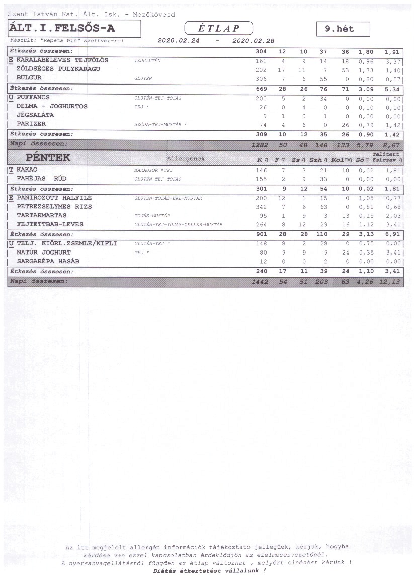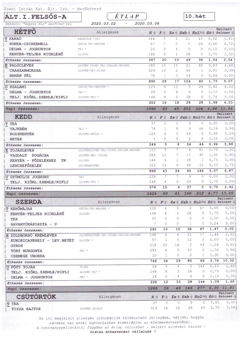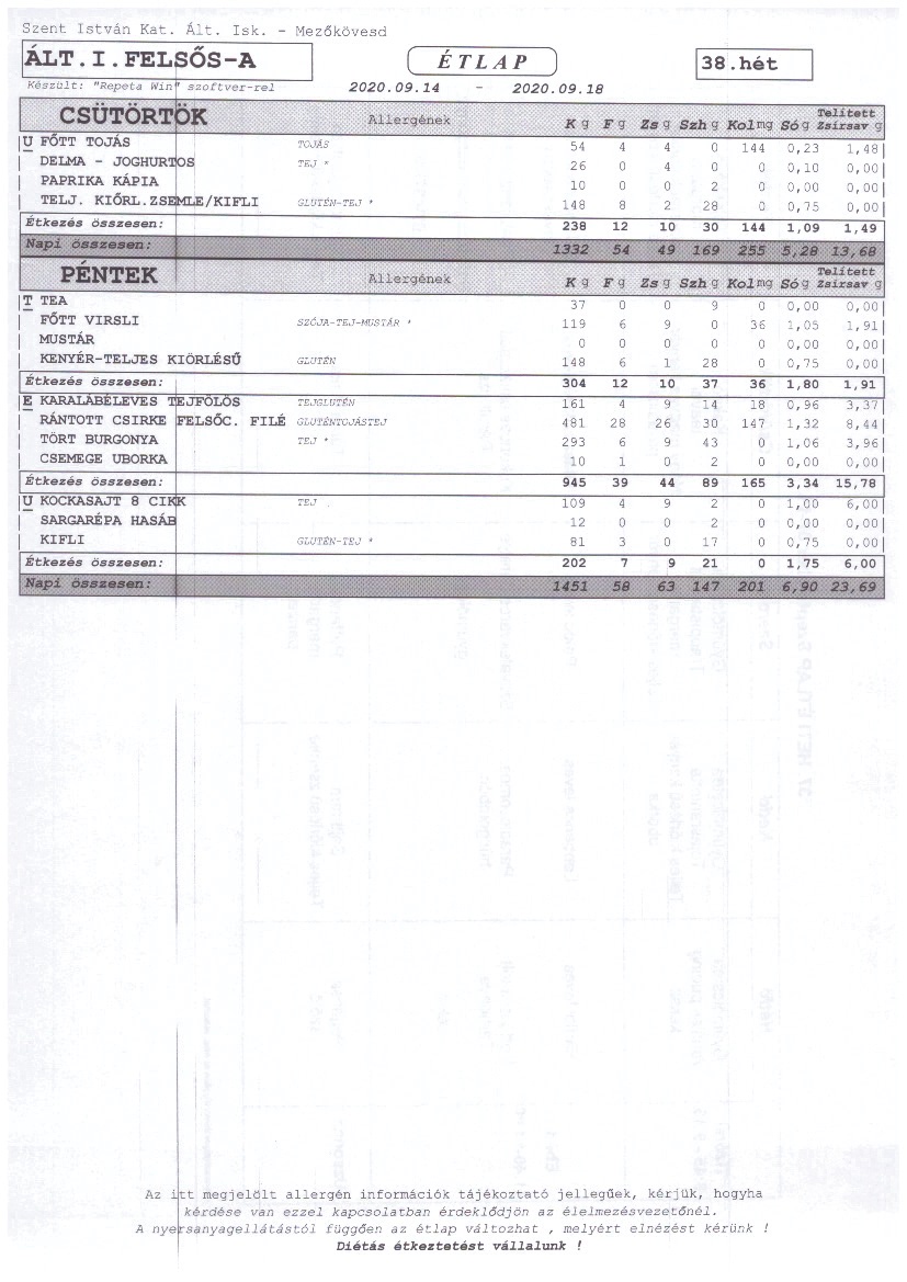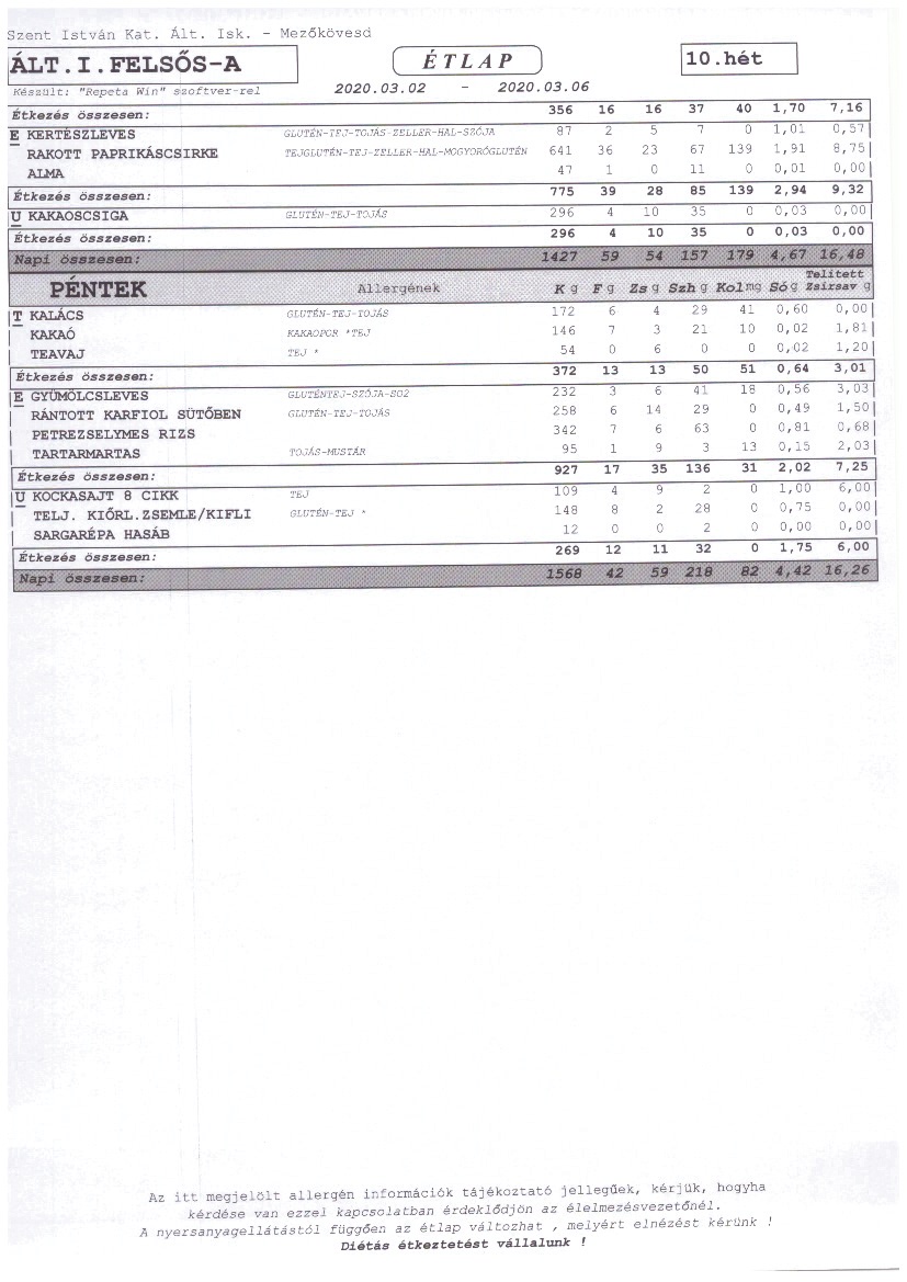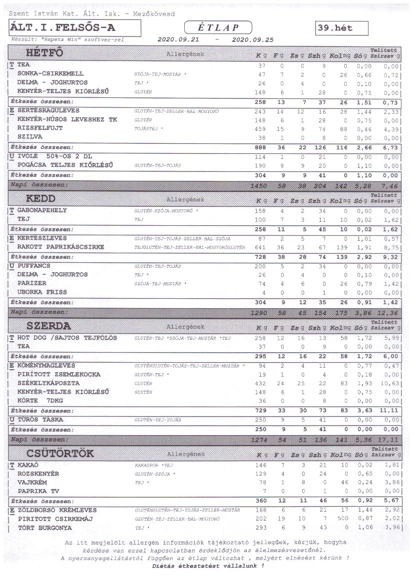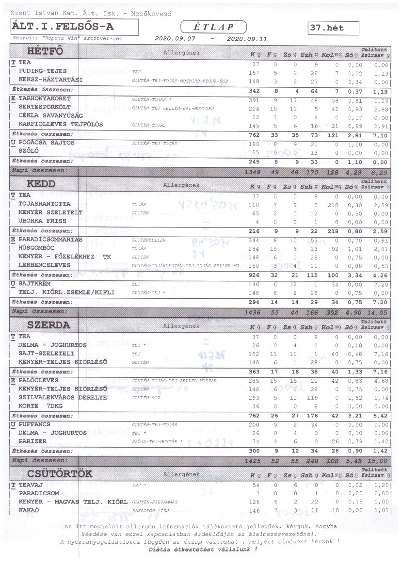 Kérjük az étkezési ill. elviteli szándékot hét elején, lehetőleg hétfőn jelezni, mert előfordulhat, hogy a későn leadott igényeket már nem tudjuk teljesíteni. Az étkezést az adott napon reggel 8:00-ig lehet lemondani.