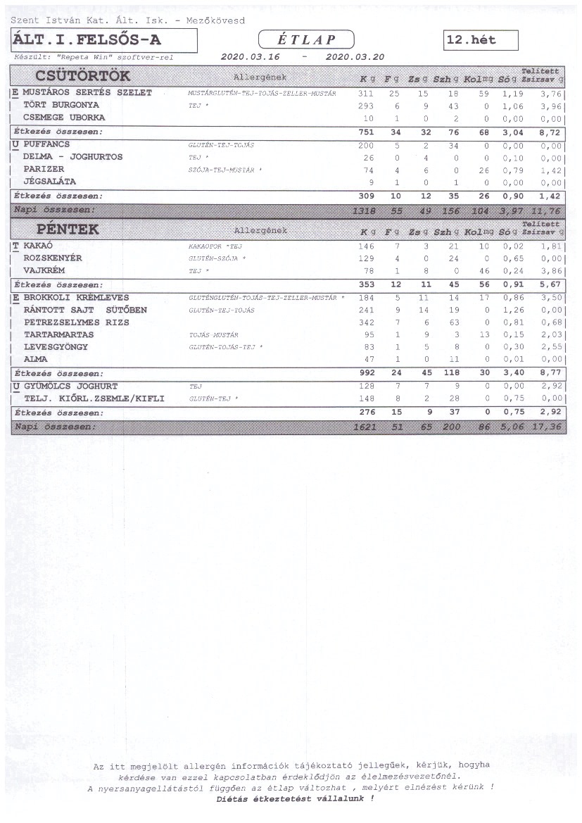 2020. január 1-től a Szent István Katolikus Általános Iskola étkezési térítési díjai: