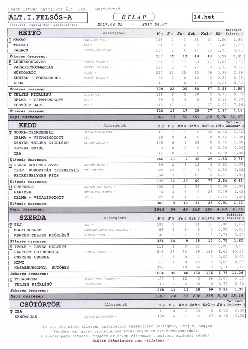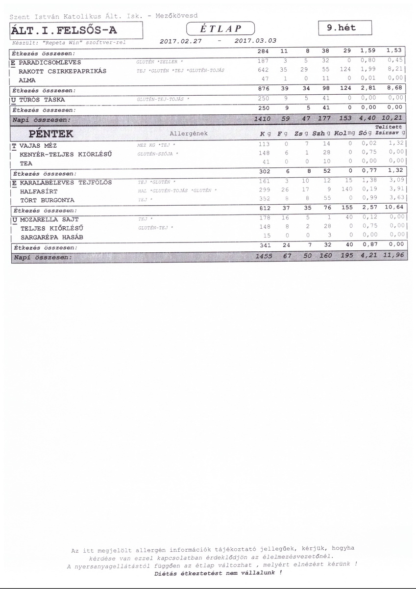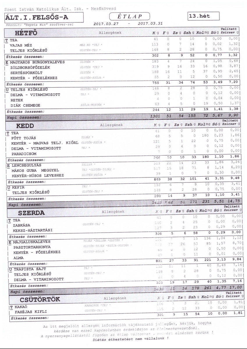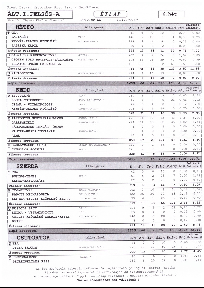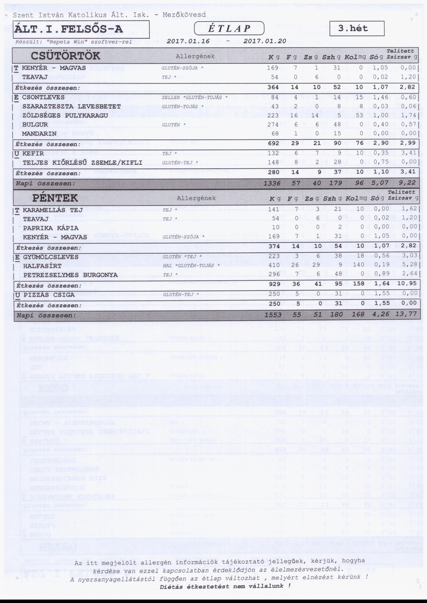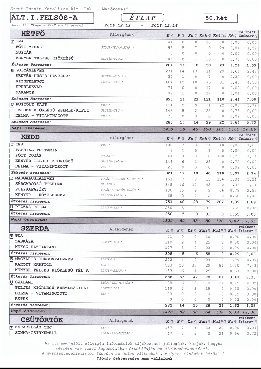 Diétás étkeztetést az iskola nem tud biztosítani.