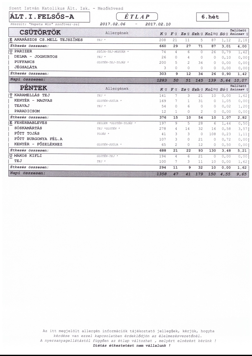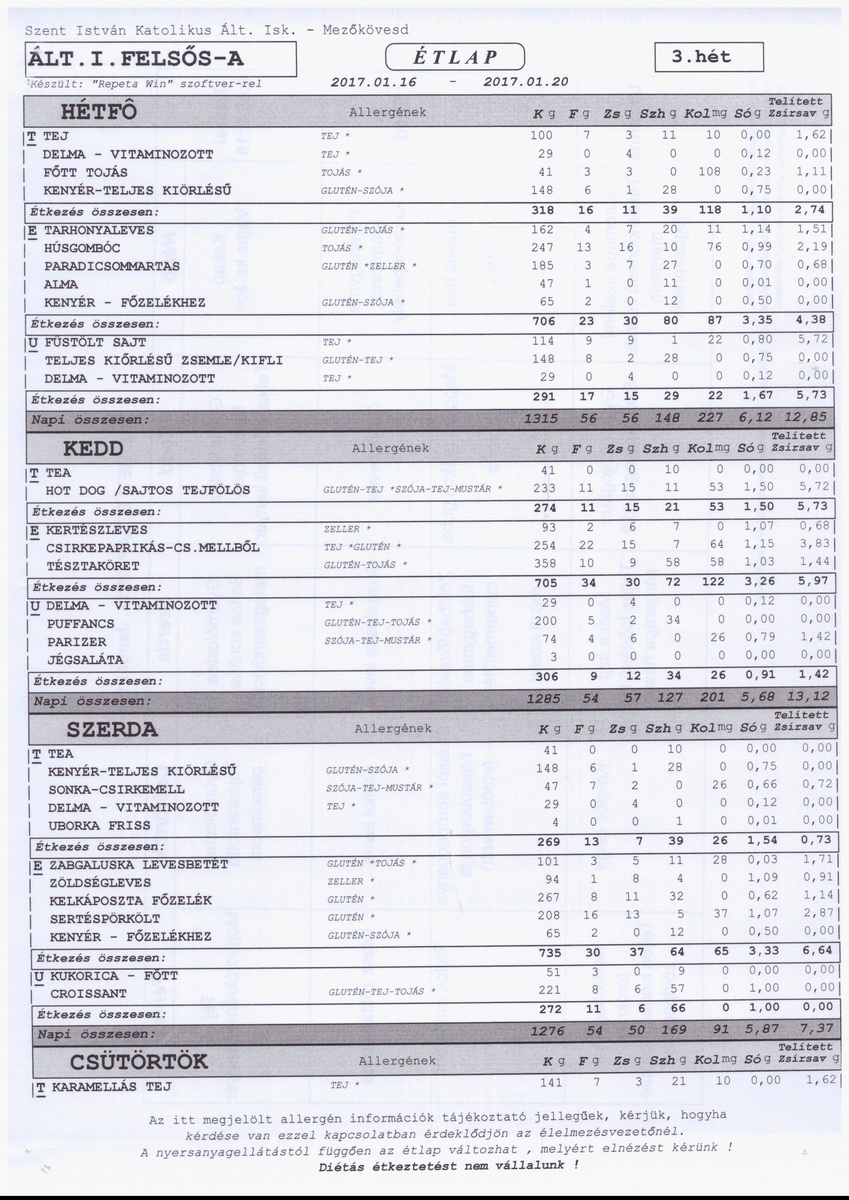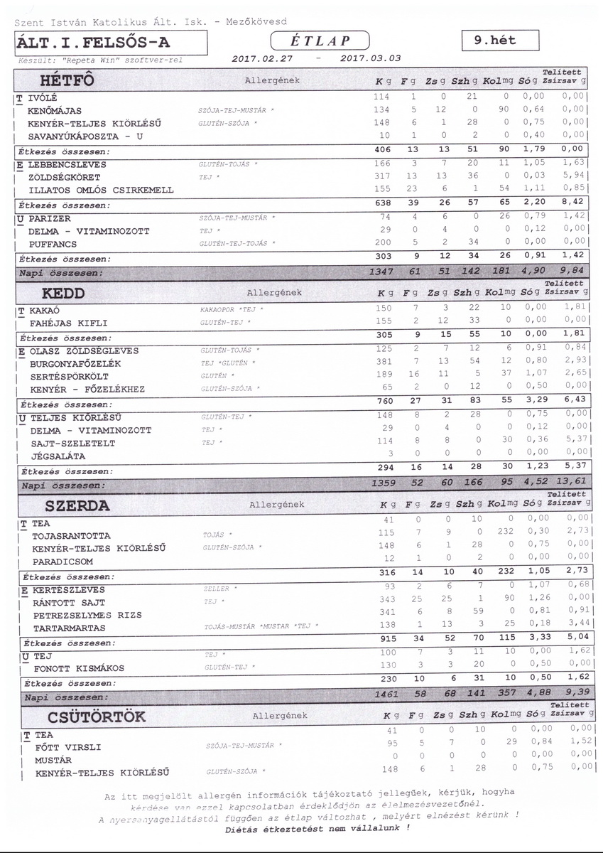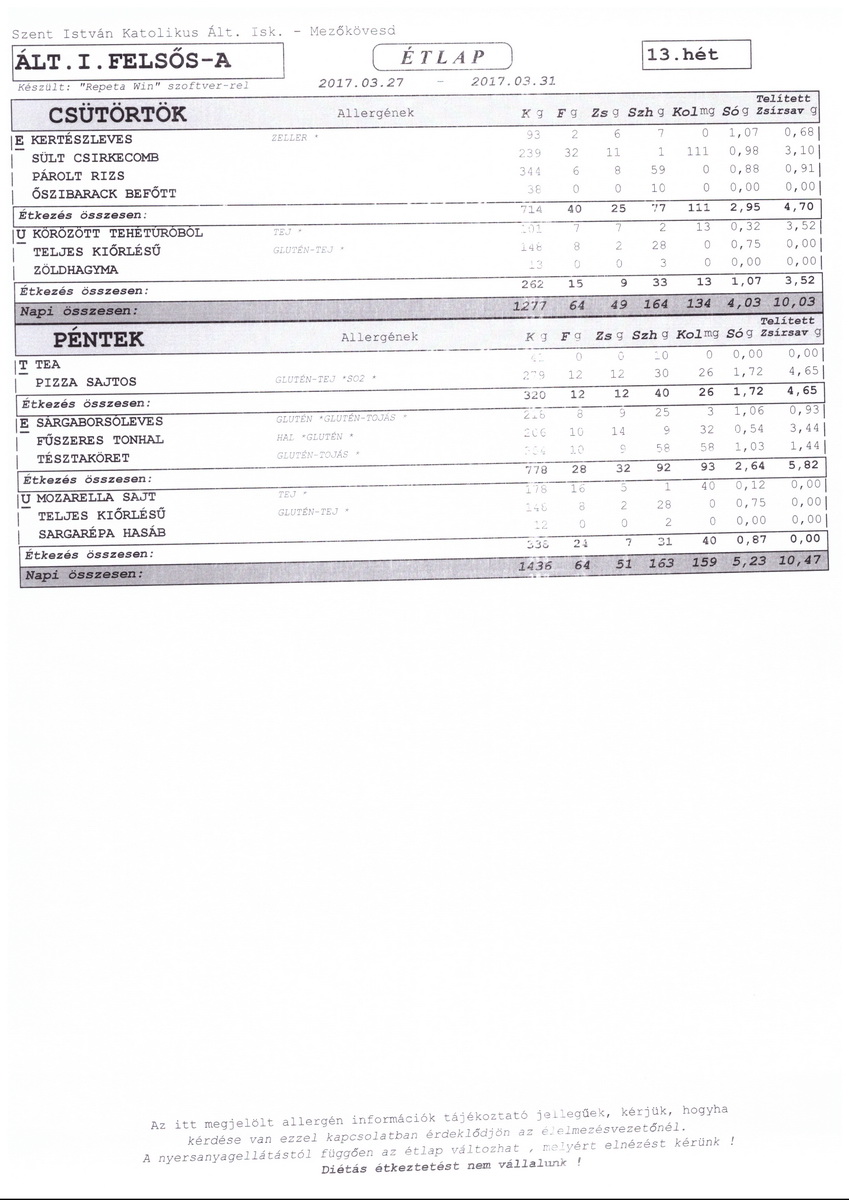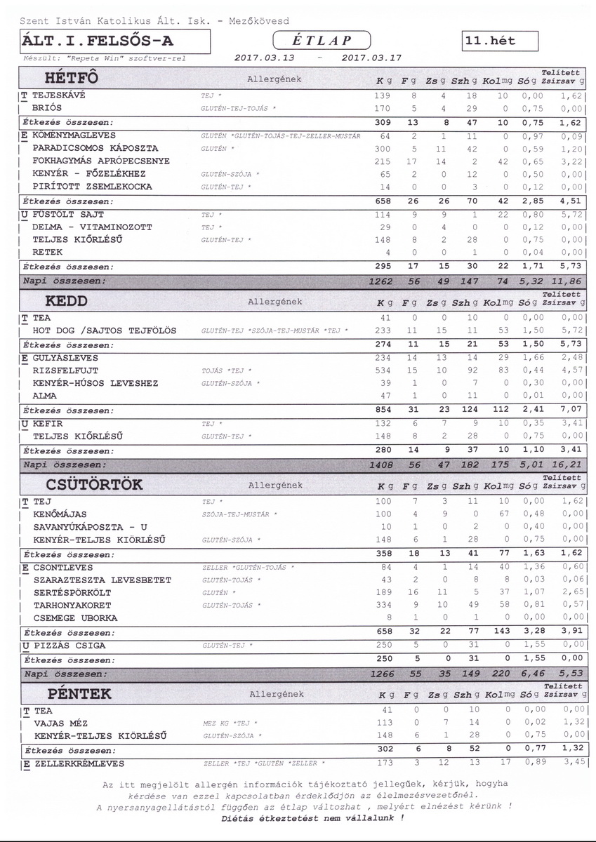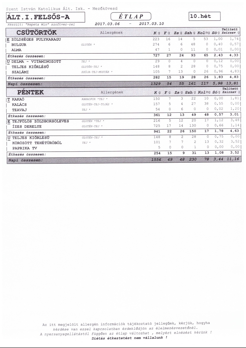 Diétás étkeztetést az iskola nem tud biztosítani.