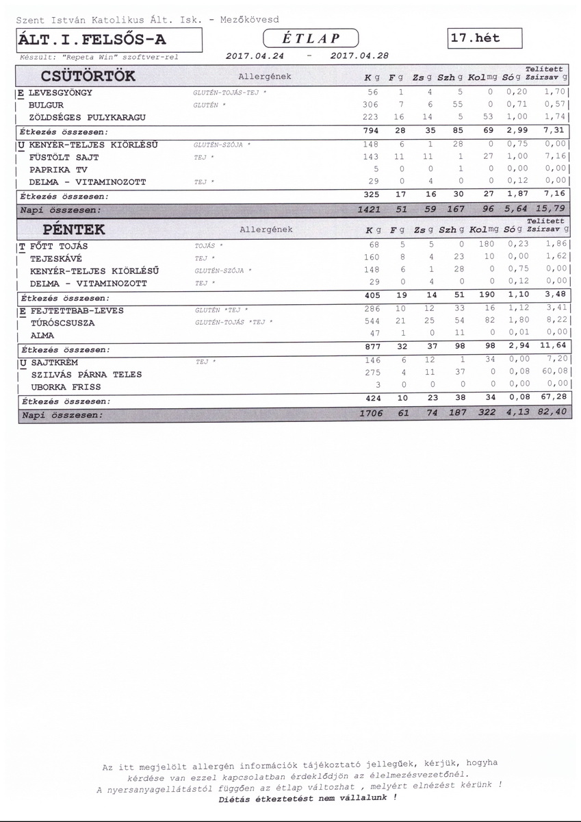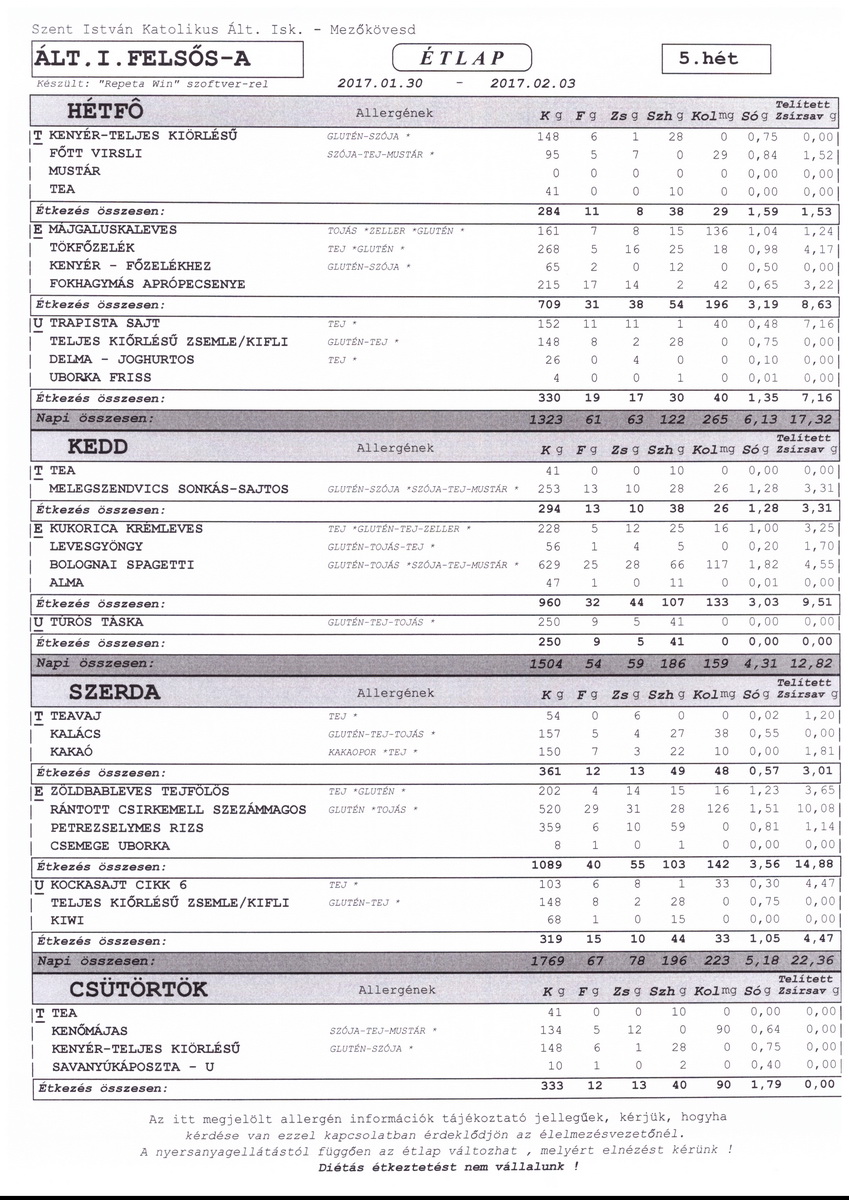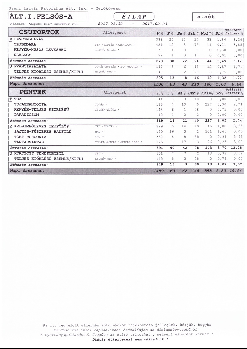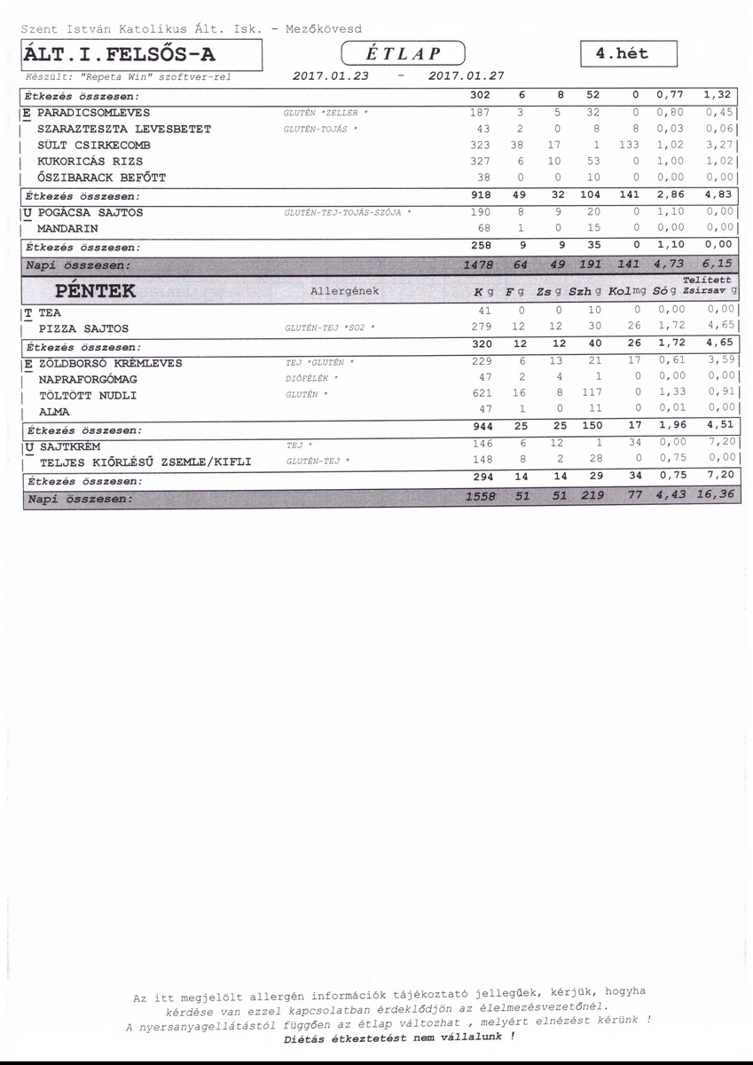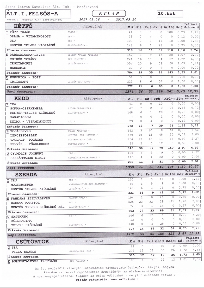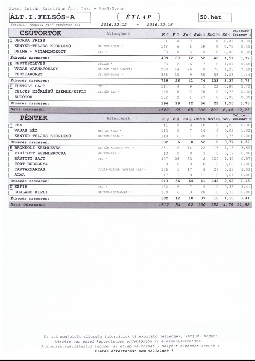 Diétás étkeztetést az iskola nem tud biztosítani.