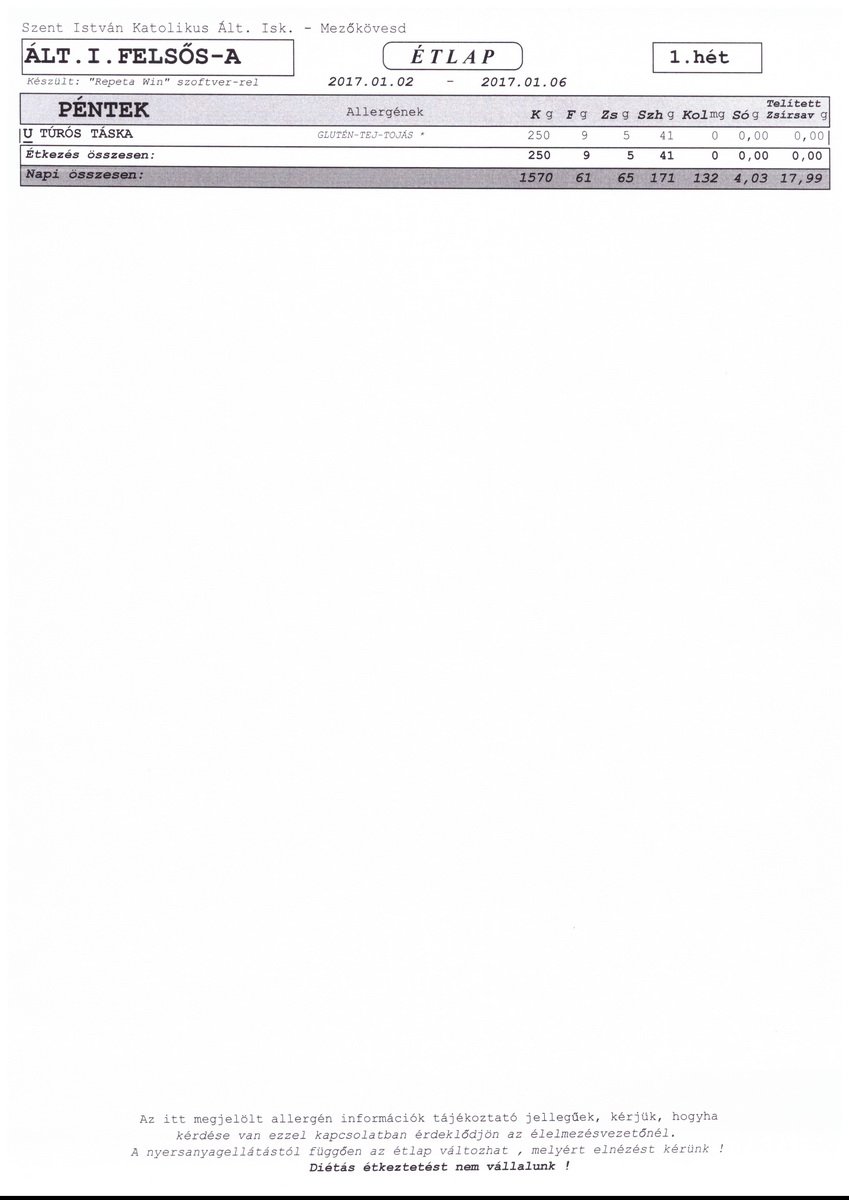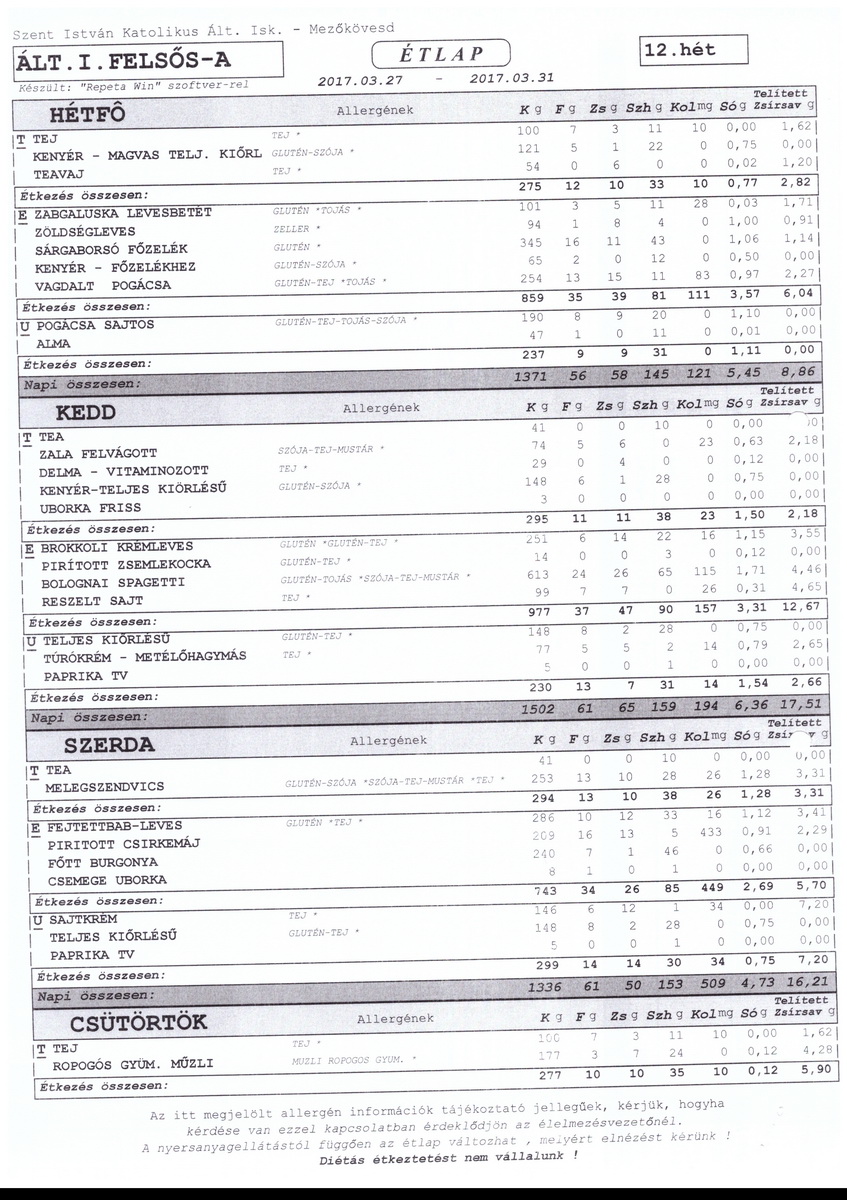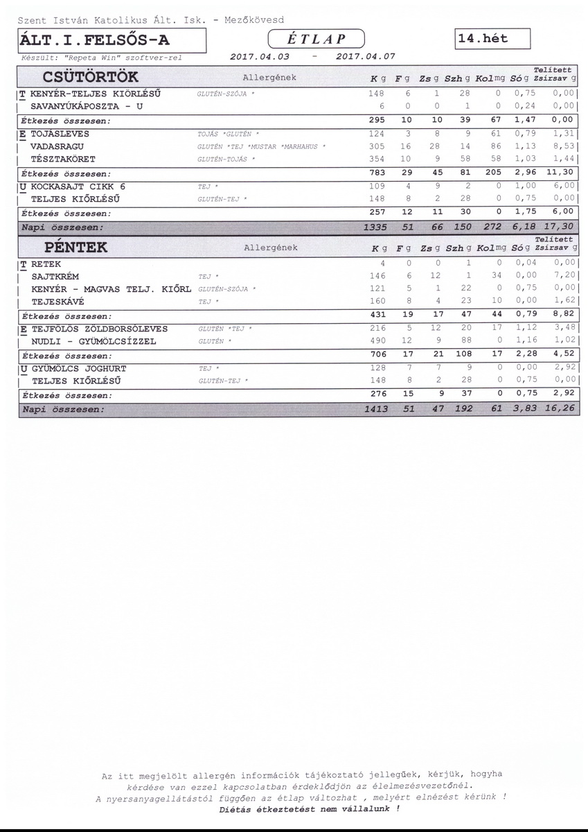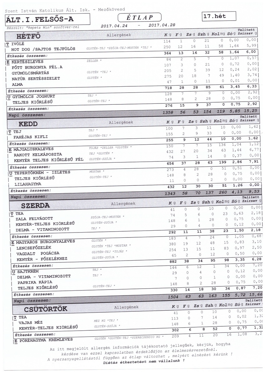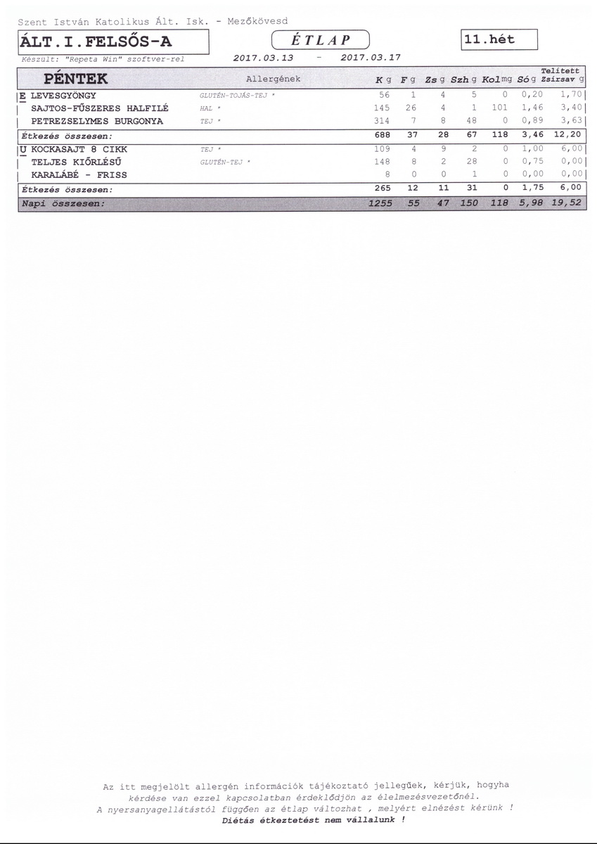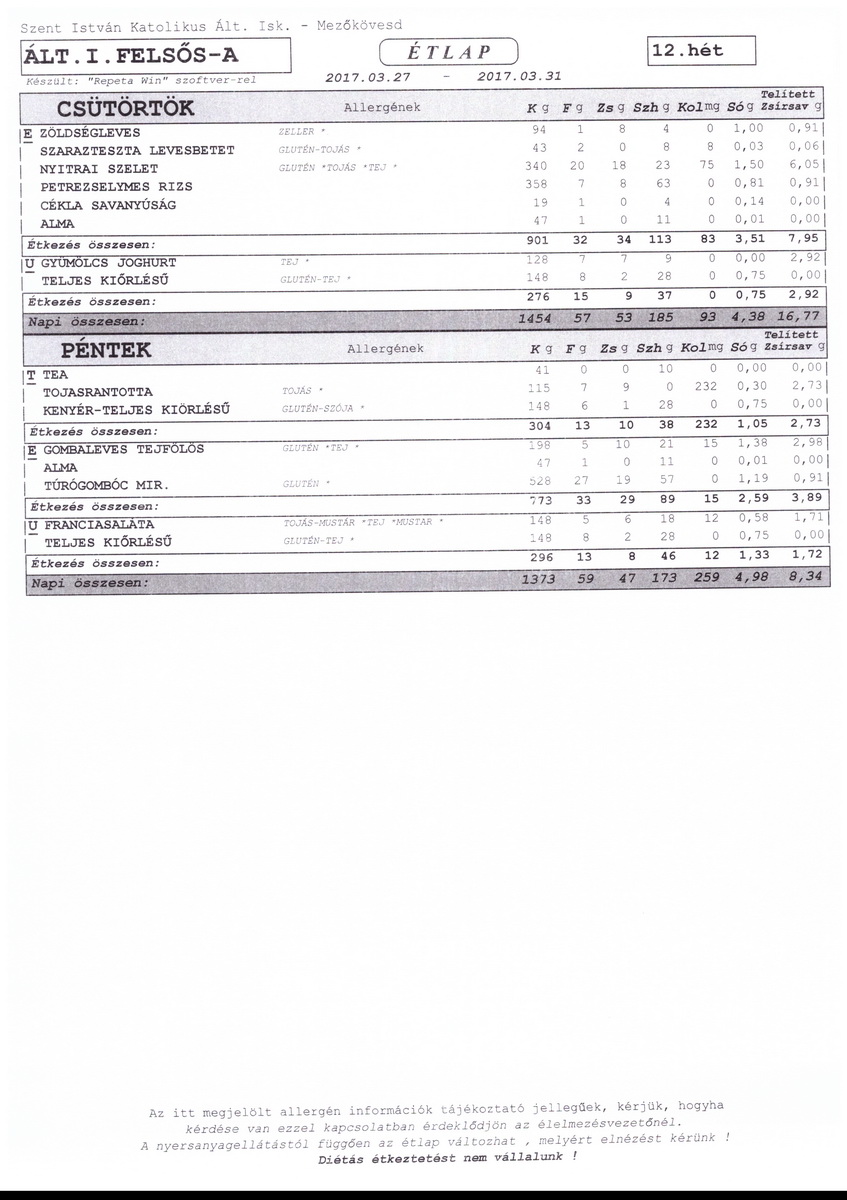 Diétás étkeztetést az iskola nem tud biztosítani.