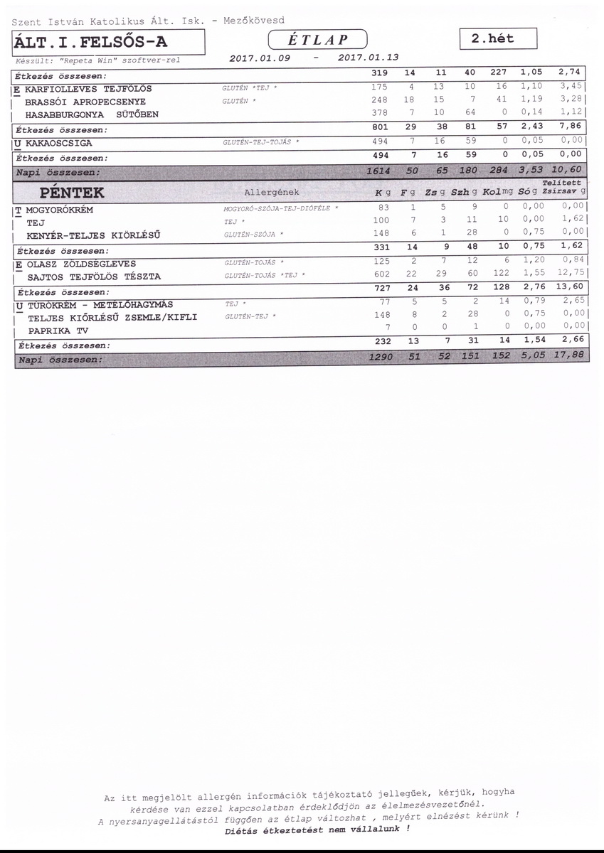 2014. január 1-től a Szent István Katolikus Általános Iskola étkezési térítési díjai: