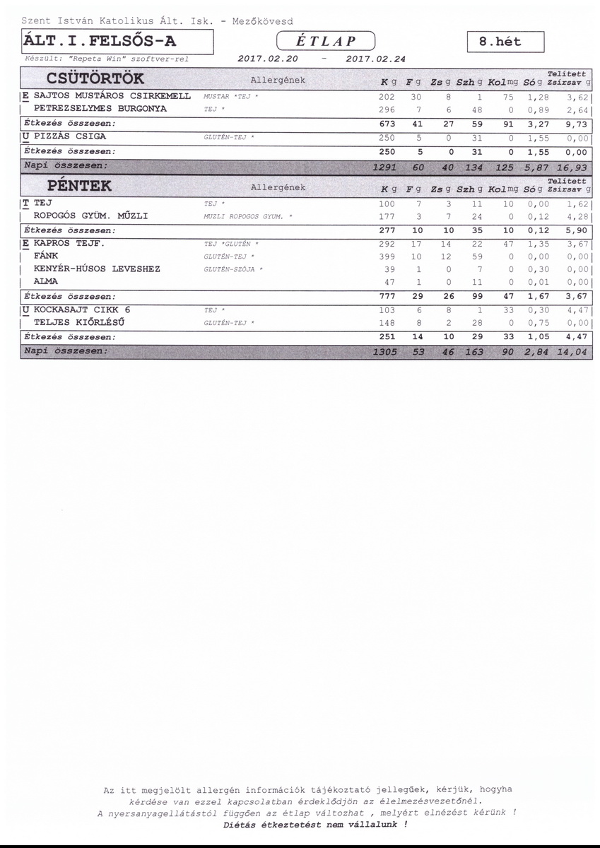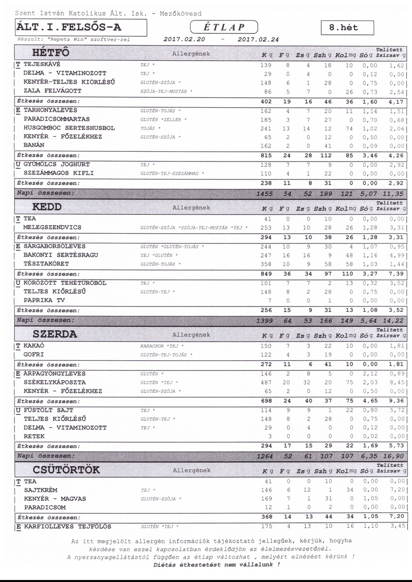 Kérjük az étkezési ill. elviteli szándékot hét elején, lehetőleg hétfőn jelezni, mert előfordulhat, hogy a későn leadott igényeket már nem tudjuk teljesíteni. Az étkezést az adott napon reggel 8:00-ig lehet lemondani.