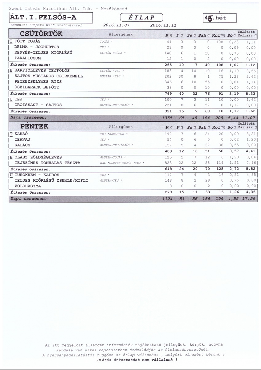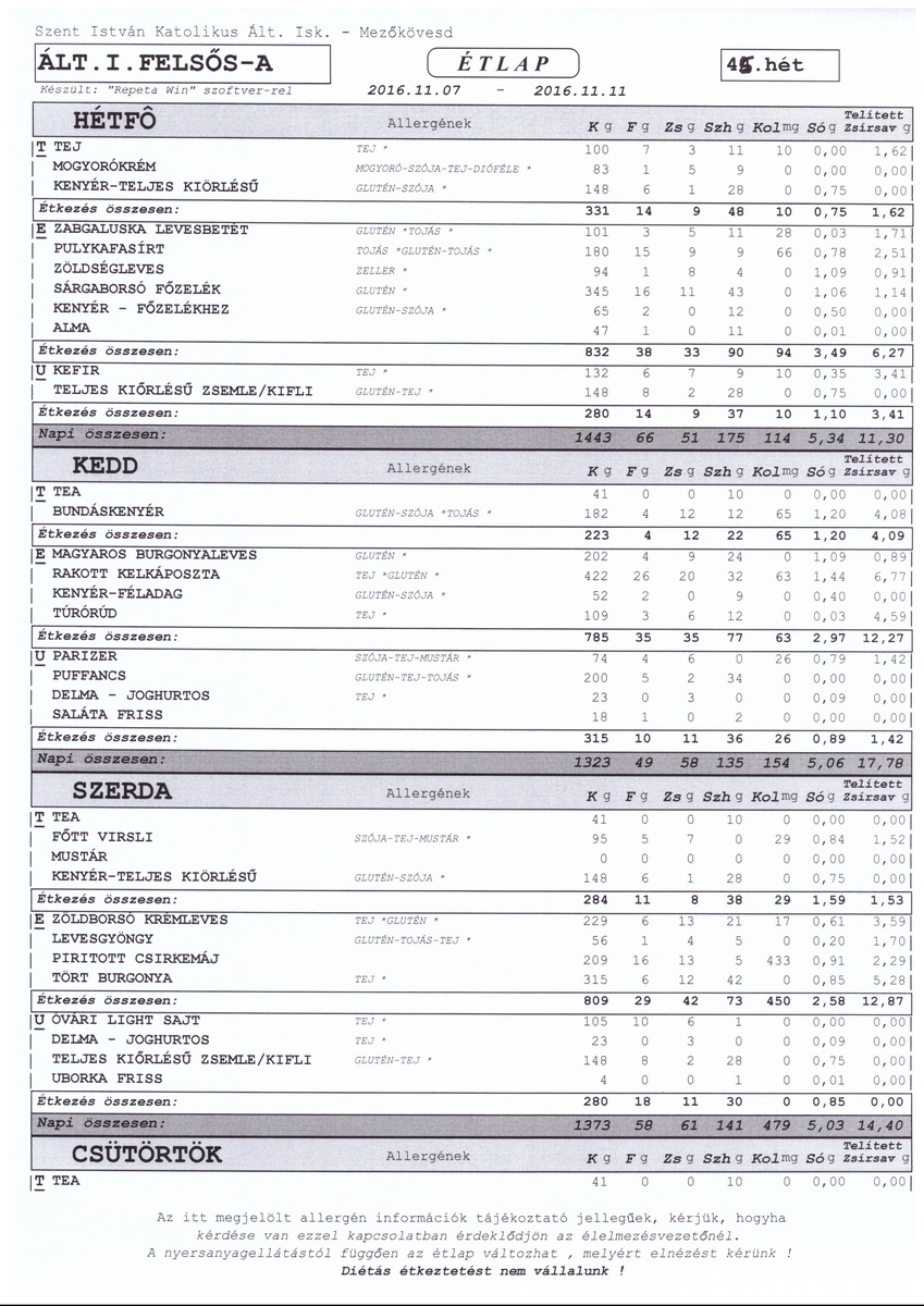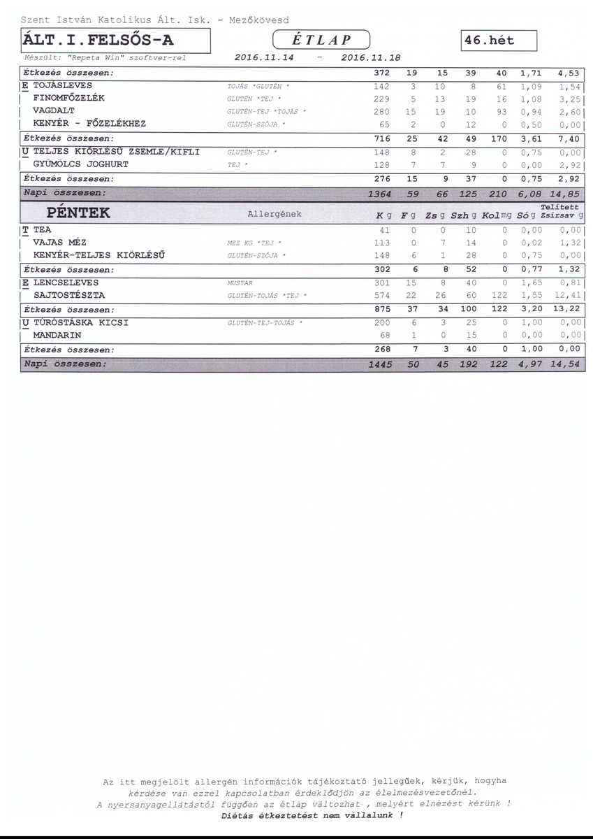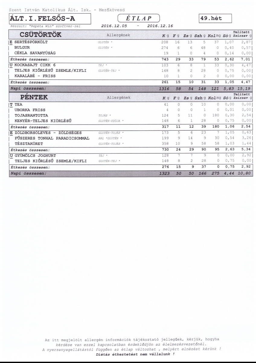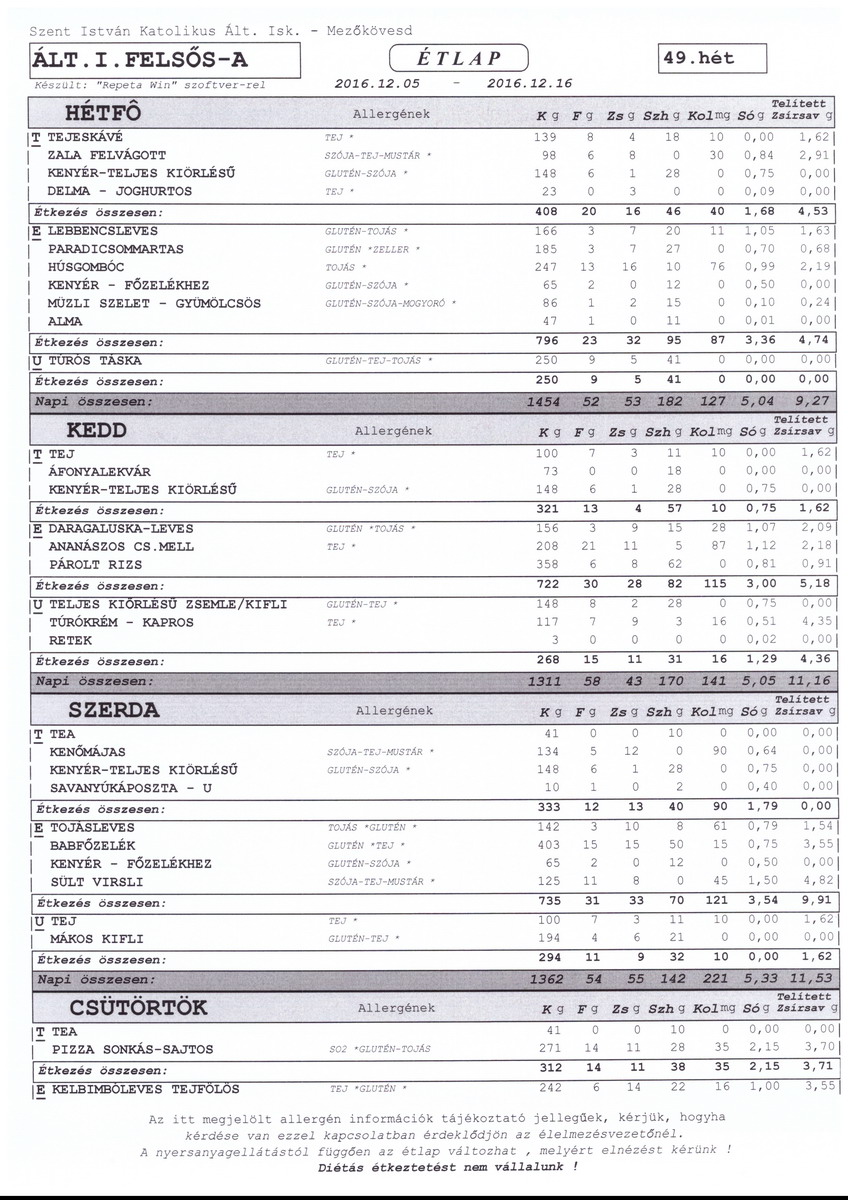 Diétás étkeztetést az iskola nem tud biztosítani.