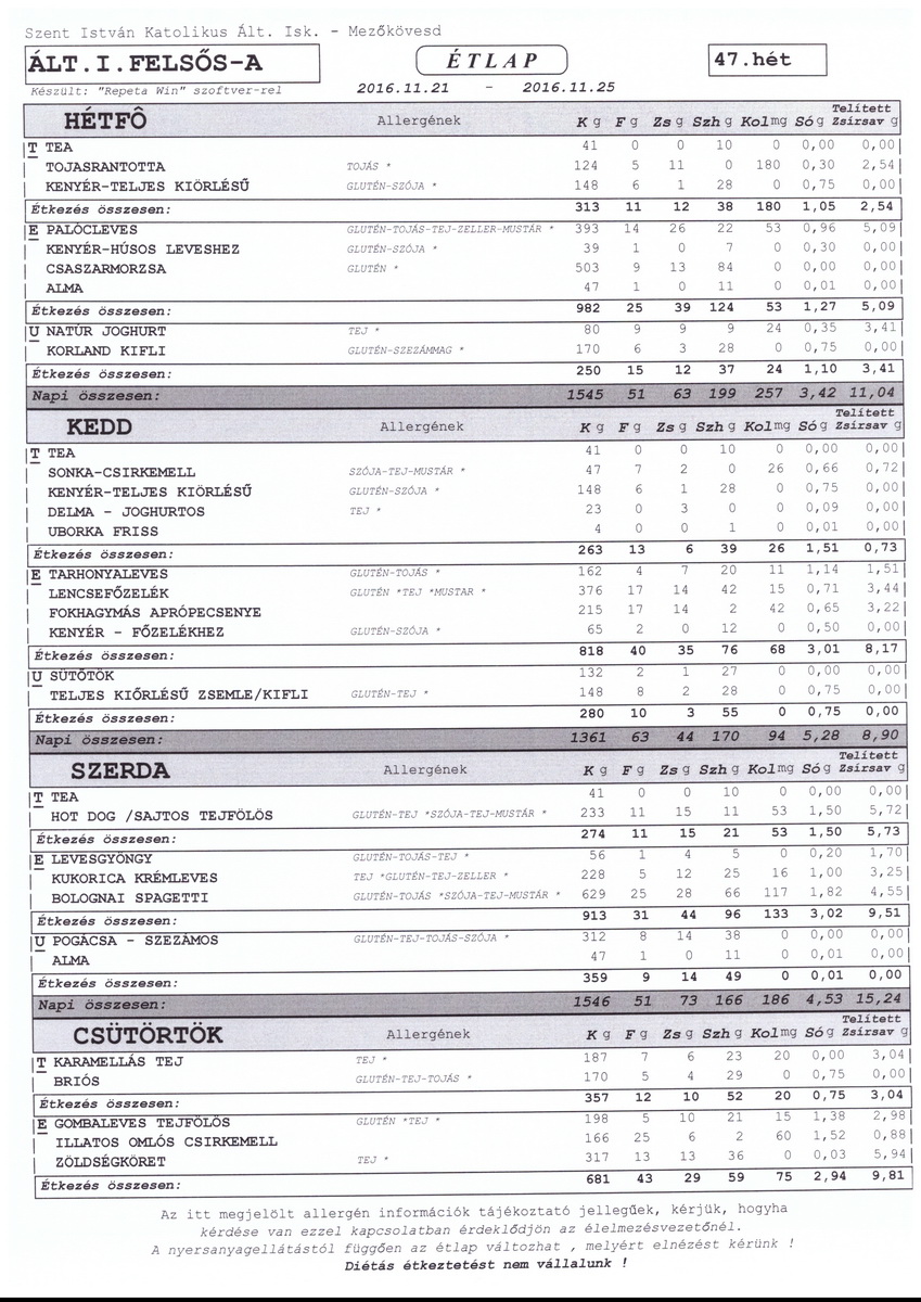 Kérjük az étkezési ill. elviteli szándékot hét elején, lehetőleg hétfőn jelezni, mert előfordulhat, hogy a későn leadott igényeket már nem tudjuk teljesíteni. Az étkezést az adott napon reggel 8:00-ig lehet lemondani.