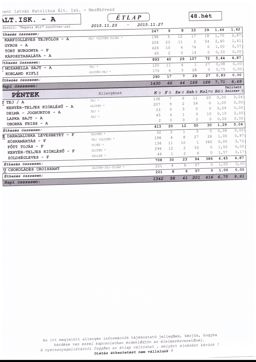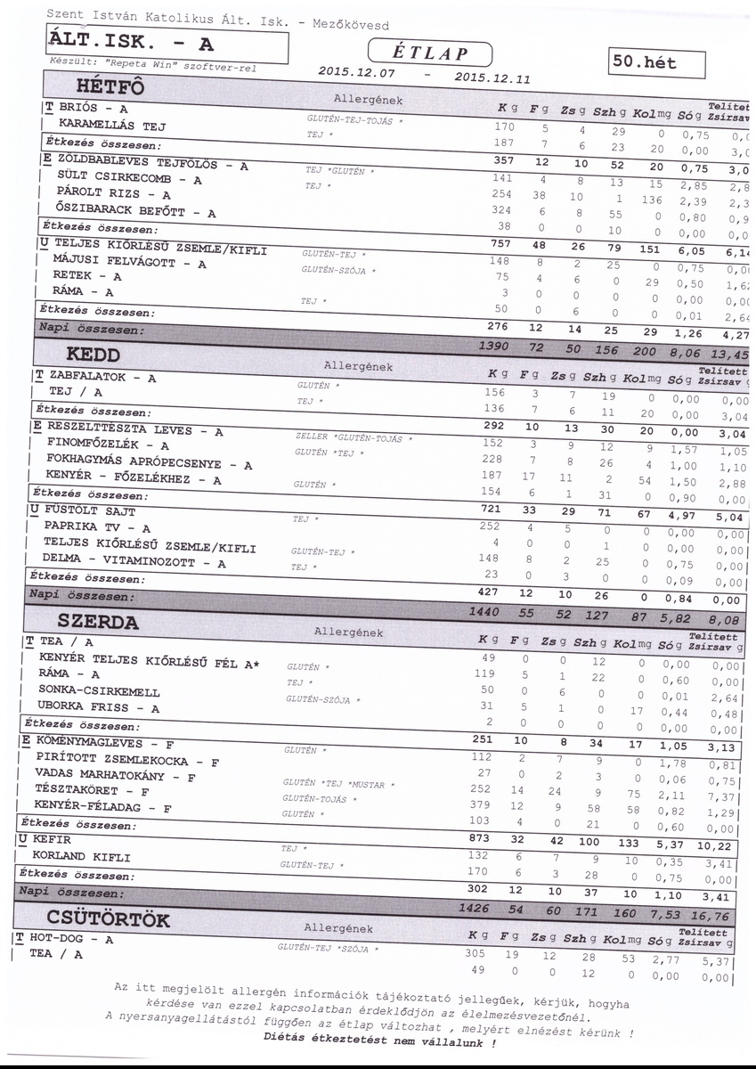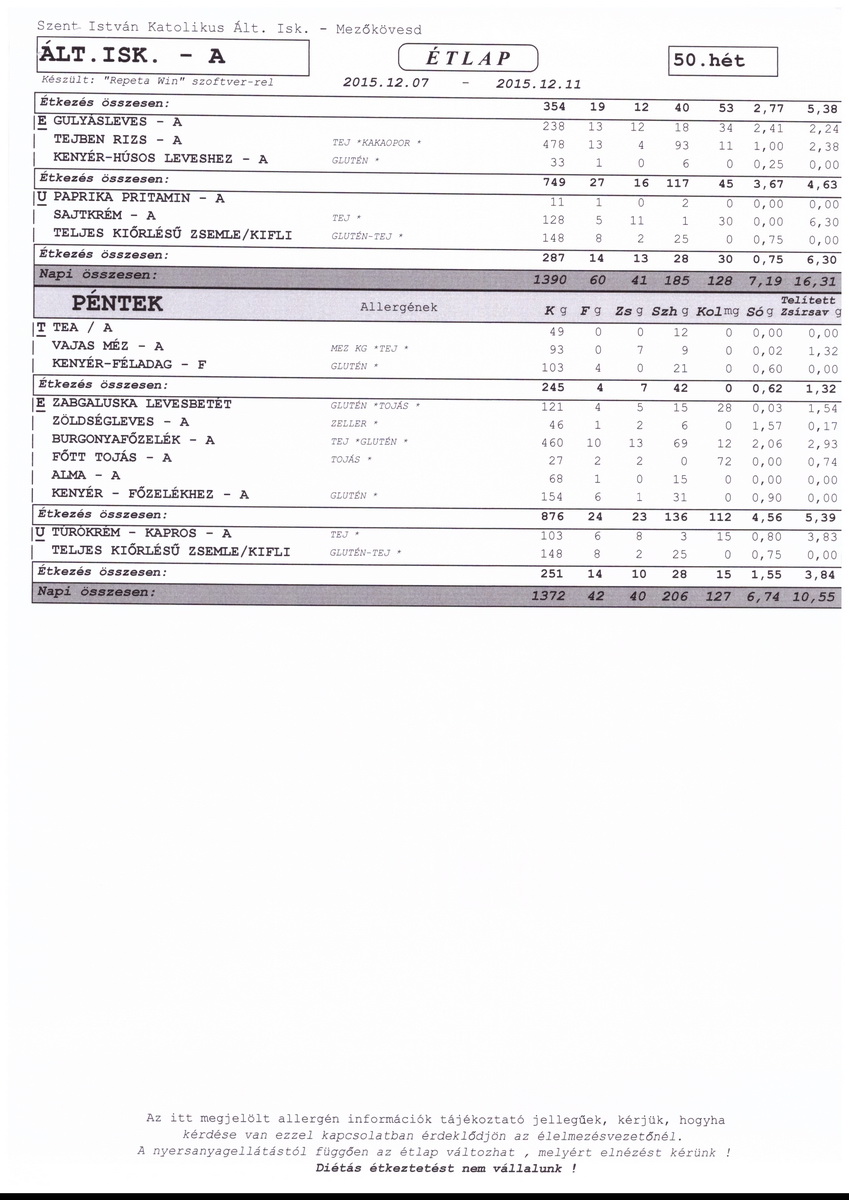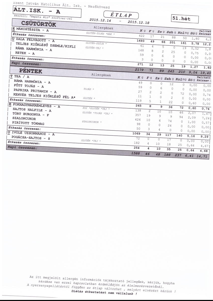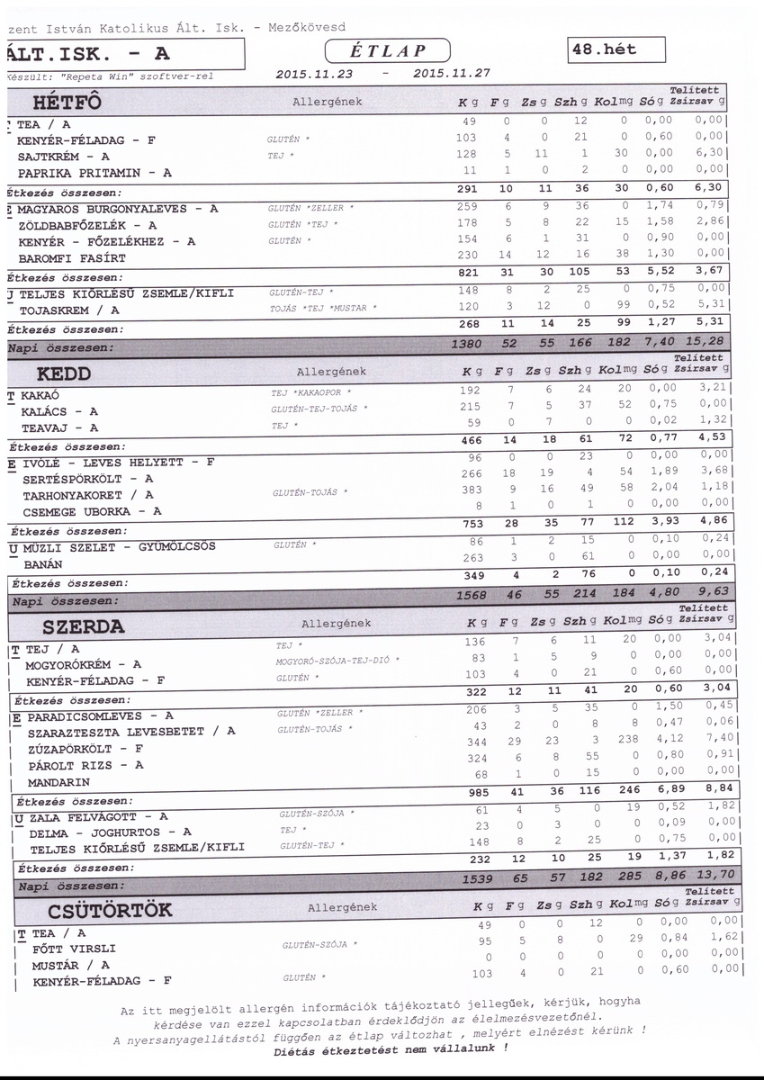 Diétás étkeztetést az iskola nem tud biztosítani.