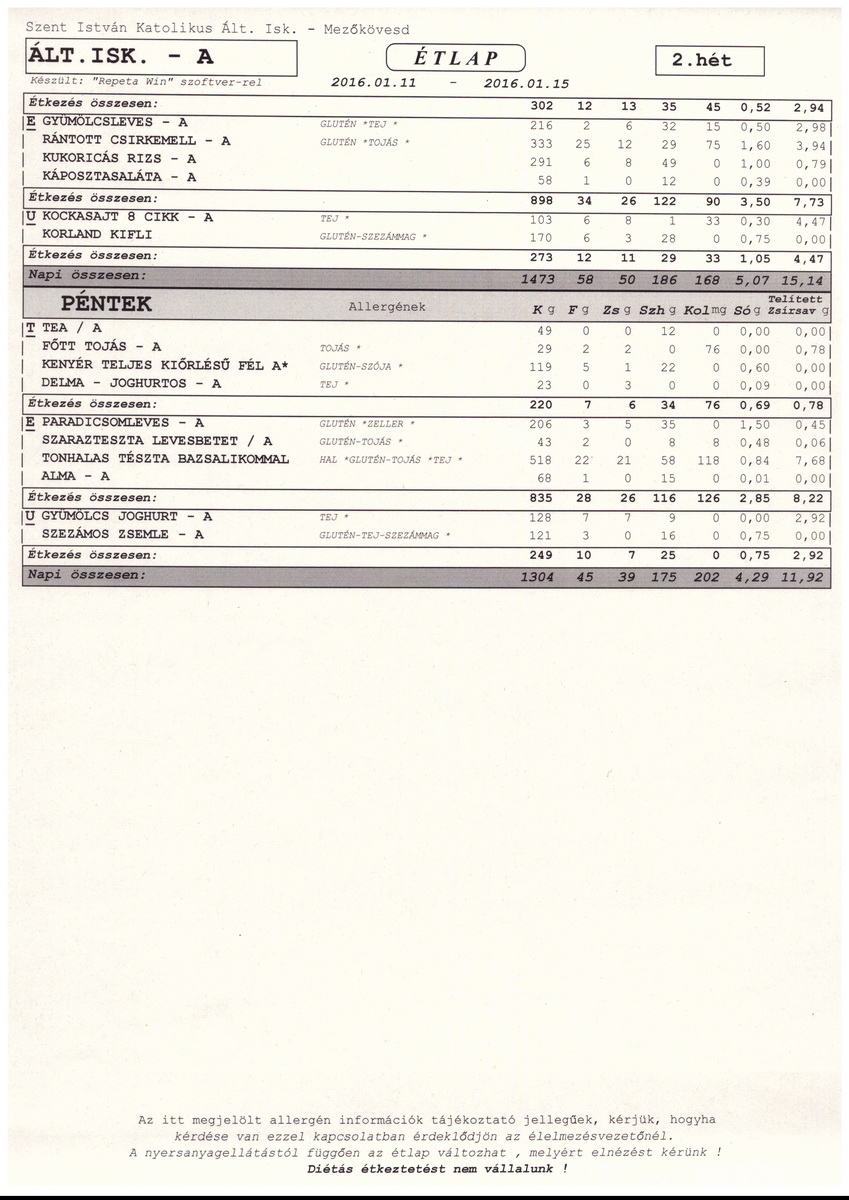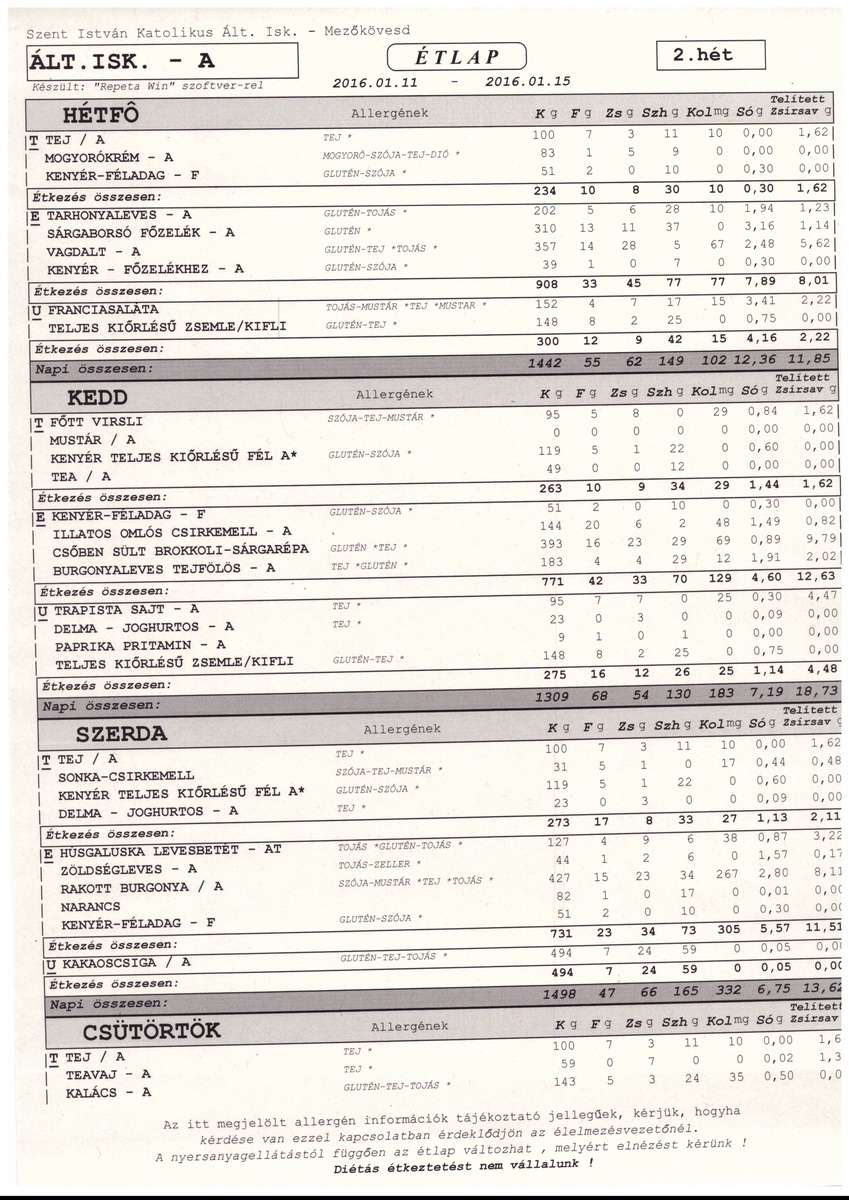 Kérjük az étkezési ill. elviteli szándékot hét elején, lehetőleg hétfőn jelezni, mert előfordulhat, hogy a későn leadott igényeket már nem tudjuk teljesíteni.Az étkezést az adott napon reggel 8:00-ig lehet lemondani.