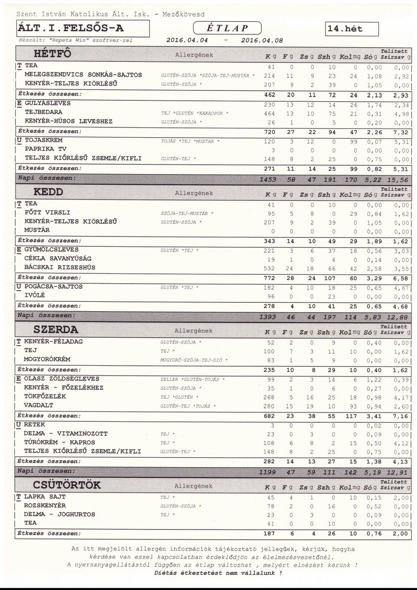 Heti étrend – 17. hét – 2016. április 25. – április 29.