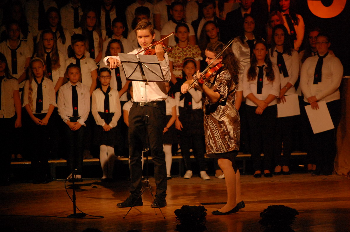 Verses-zenés összeállításunkban minden osztály legjobbjai vettek részt. Nagy öröm volt számunkra, hogy mostani tanítványaink mellett régi diákjaink is jelen voltak ünnepségünkön. Ők meghallották hívó szavunkat, és eljöttek velünk ünnepelni. Van közöttük vegyészmérnök, hegedűtanárnő, tanítónő, óvónő, egyetemi hallgató, középiskolás diák, leendő mérnök, matematikus. Ők beálltak az énekkar soraiba és verset is mondtak. Közülük Török Bernadett és Nagy Mátyás csodás hegedűjátékukkal kápráztatták el a közönséget.