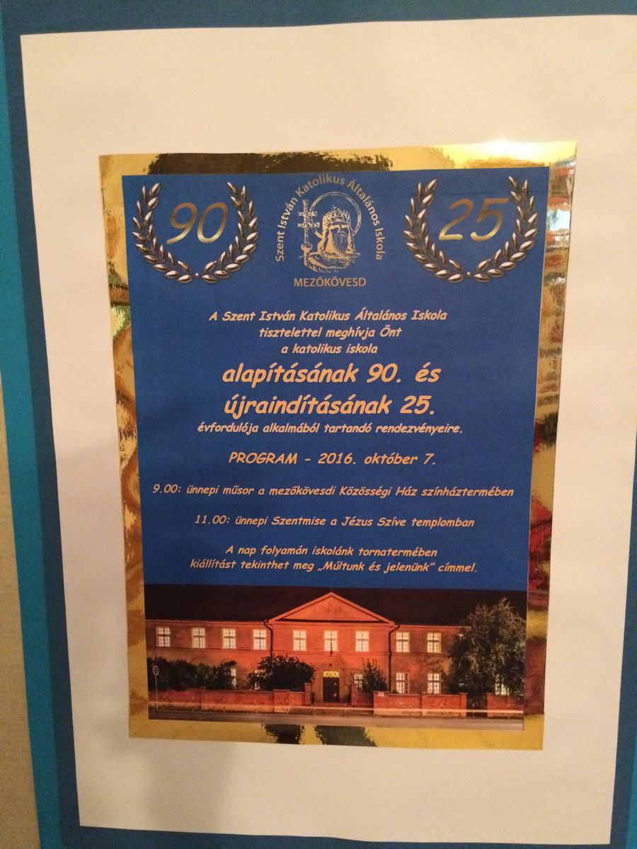 Arra emlékezünk, hogy elindult Mezőkövesden az Egyházi elemi népoktatás. Két dátumot írtak fel kollegáim ide. Kilencven évvel ezelőtt a település vezetői élén Dr. Kiszely Pál jegyző úr úgy gondolták építenek egy modern iskolát. Szmrecsányi Lajos egri érsek támogatta az elképzelést és az akkori vallás és közoktatási miniszter Gróf Klebersberg Kunó anyagi forrást is biztosított. A település vezetése az iskola működtetésére felkérte az Isteni Megváltó Leányai apácarendet, mivel azt gondolták, hogy jó kezekbe került az oktatás ügye. Ez így is lett. Az apácák nagyon jó munkát végeztek és az itt élők hamar szívükbe zárták őket és szerették az iskolát. Sajnos a kommunista diktatúra véget vetett a katolikus oktatásnak és elzavarták a nővéreket az iskolából. Így történhetett,hogy negyvenegynehány év elteltével a rendszerváltozás után újra el kellett indítani a katolikus oktatást a városban. A Jézus Szíve Plébánia plébánosa Balog Simon esperes atya, Veres András káplán atya és a szülők kezdeményezésére Molnár Mária vezetésével újra elindult a katolikus oktatás. A működtetést az egri főegyházmegye vezetője Dr. Seregély István érsek atya vállalta. Ha a két indulás között akarunk párhuzamot keresni, akkor sok hasonlóságot találhatunk.