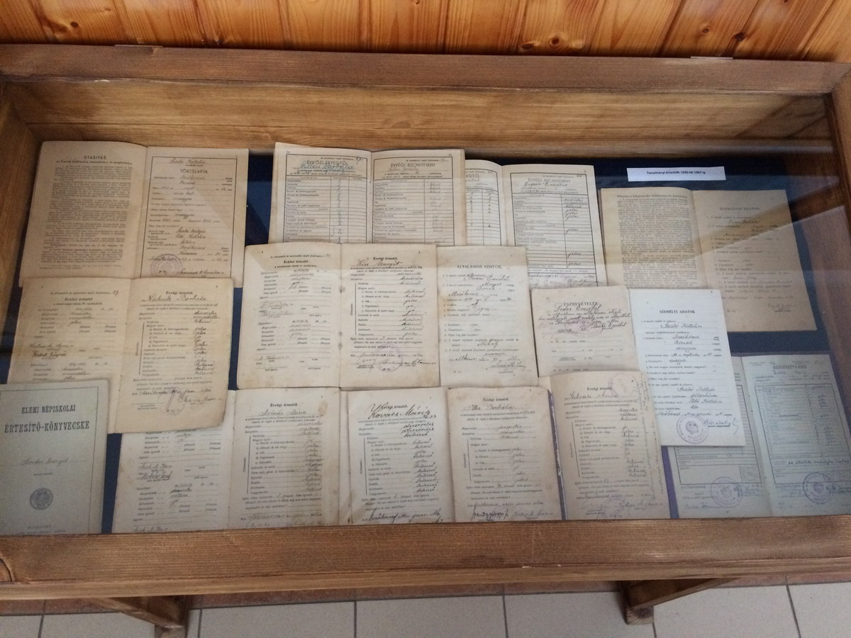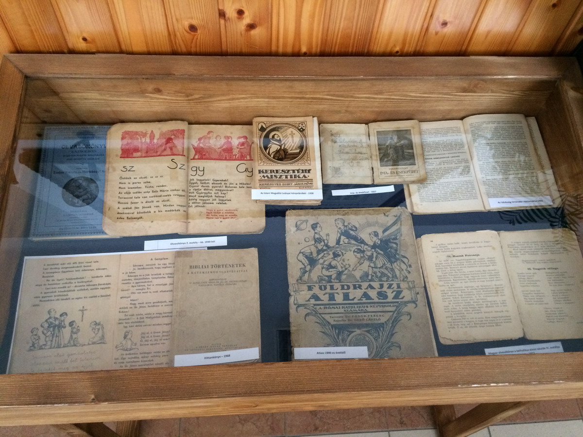 A tablókon az iskola életét felelevenítő képek láthatók, a tárlókban régi, az iskolához kapcsolódó dokumentum látható, mint pl. iskolai bizo