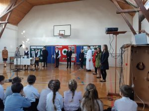 Március 14-én, kedden az 1. órában a 3. b és az 5. a osztály tanulói vidám, játékos műsor keretén belül emlékeztek meg a hősökről, hős katonákról. Először felelevenítették, hogy mi is történt ezen a napon, majd a kisbéres vidám énekével kezdetét vette a megemlékezés. A birkajelmezbe öltözött 5-es fiúk mosolyt csaltak a kicsik és nagyok arcára egyaránt. A jelenetben szereplő ügyes 3-os gyerekek szép szereplését végén a közönség vastapssal jutalmazta.