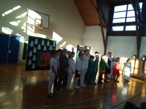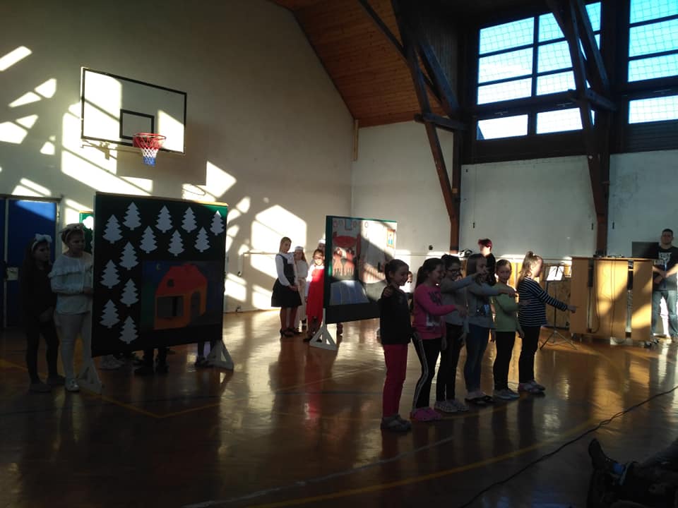 A tornateremben szép díszletek között a 3.b osztály színvonalas műsorral köszöntötte a kicsiket. Vidám jelenet, versek dalok, zenei betétek tették élvezetessé a műsort.