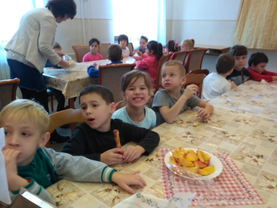 Az ebédlőben terített asztalnál sós süteménnyel és almával vendégeltük meg őket. A negyedikesek által készített ajándéknak minden óvodás nagyon örült.