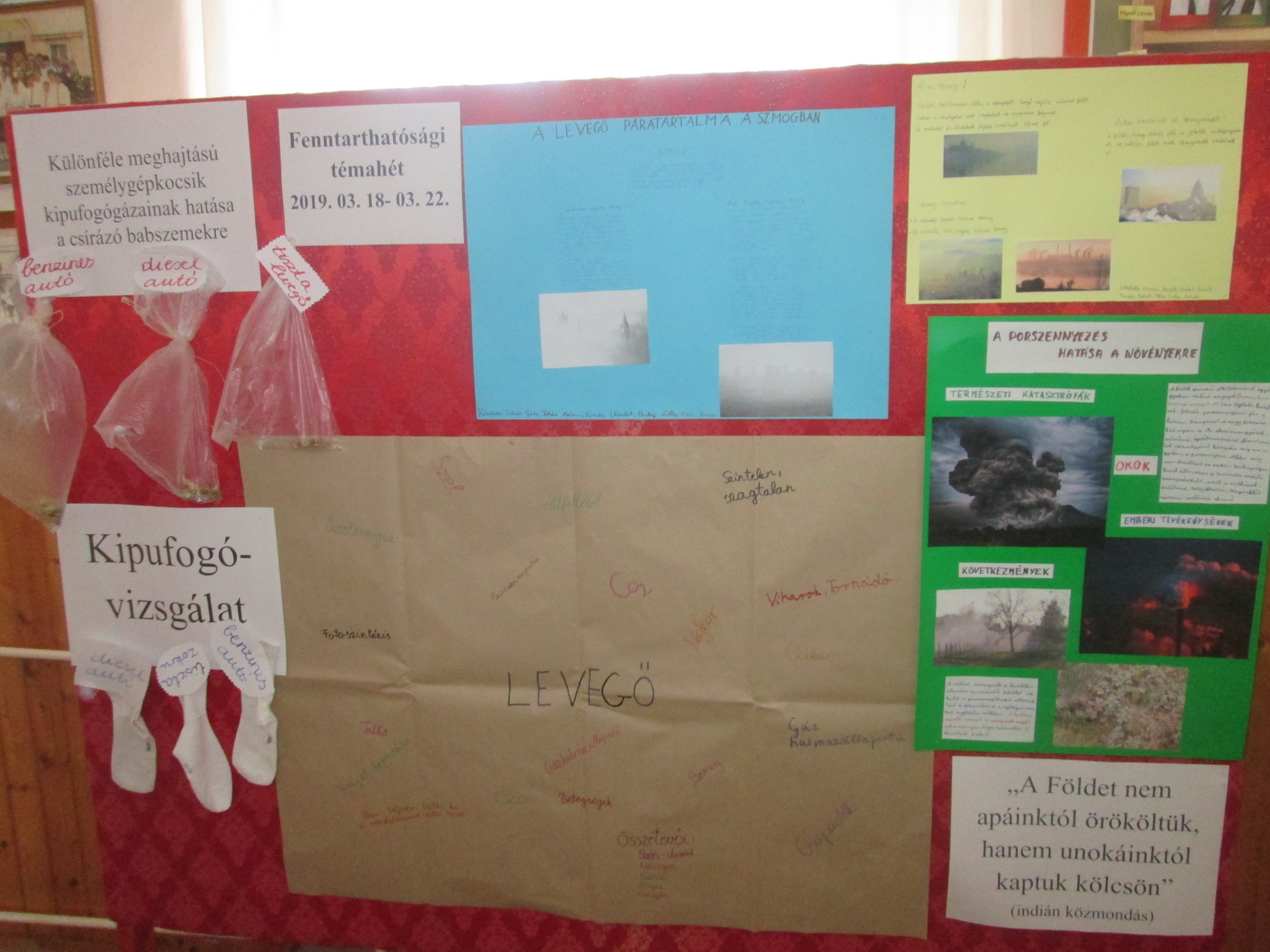 2019. március 18-22. között az Emberi Erőforrások Minisztériuma a 2018/2019. tanévben negyedik alkalommal hirdette meg a Fenntarthatósági Témahetet. Az idei év kiemelt témakörei a közlekedés, a vízvédelem és az ENSZ által 2015-ben megfogalmazott fenntartható fejlődési célok voltak.