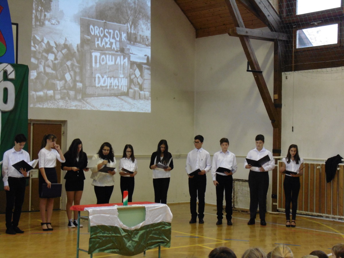 Október 21-én az első órában került sor az október 23-i forradalom megünneplésére, amelynek műsorszámait a nyolcadik évfolyamos tanulók adták elő. A színpompás díszleteket szintén a nyolcadikos tanulók készítették el technika órán.A versek és a zeneszámok megpróbáltak méltó emléket visszatükrözni a forradalom és szabadságharc nagy alakjairól: Mindszenty József hercegprímásról, Nagy Imre miniszterelnökről, Maléter Pál hadügyminiszterről és a pesti srácokról.