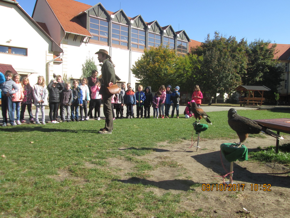 Ezután a szabadban a ragadozó madarak életével kapcsolatos bemutatót láthattak, hallhattak sok-sok történettel teletűzdelve kisdiákjaink. A bemutatót a Hortobágyi Nemzeti Park munkatársa tartotta.Reptette a madarakat, közelről meg lehetett nézni, meg lehetett figyelni mozgásukat is. A gyerekek nagy csodálattal figyelték az előadást a ragadozó madarakról.