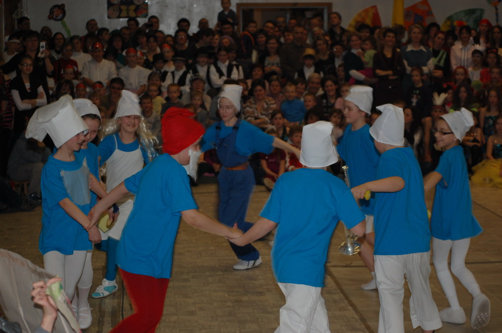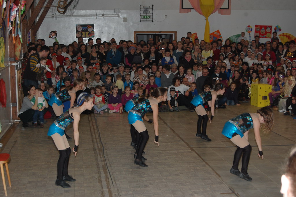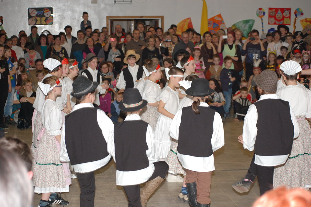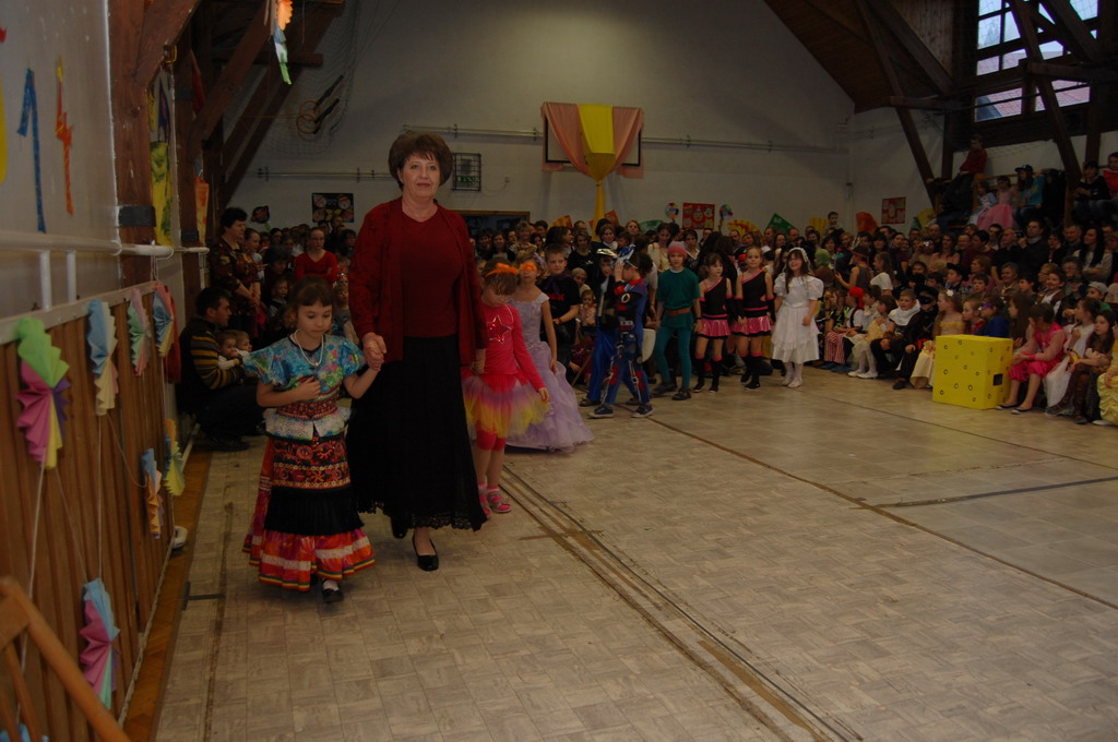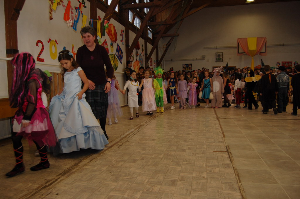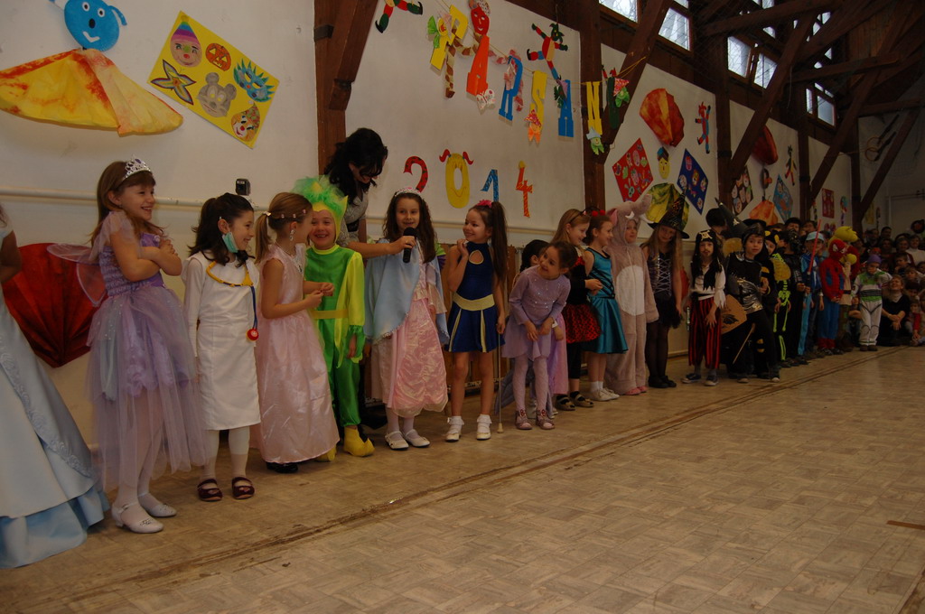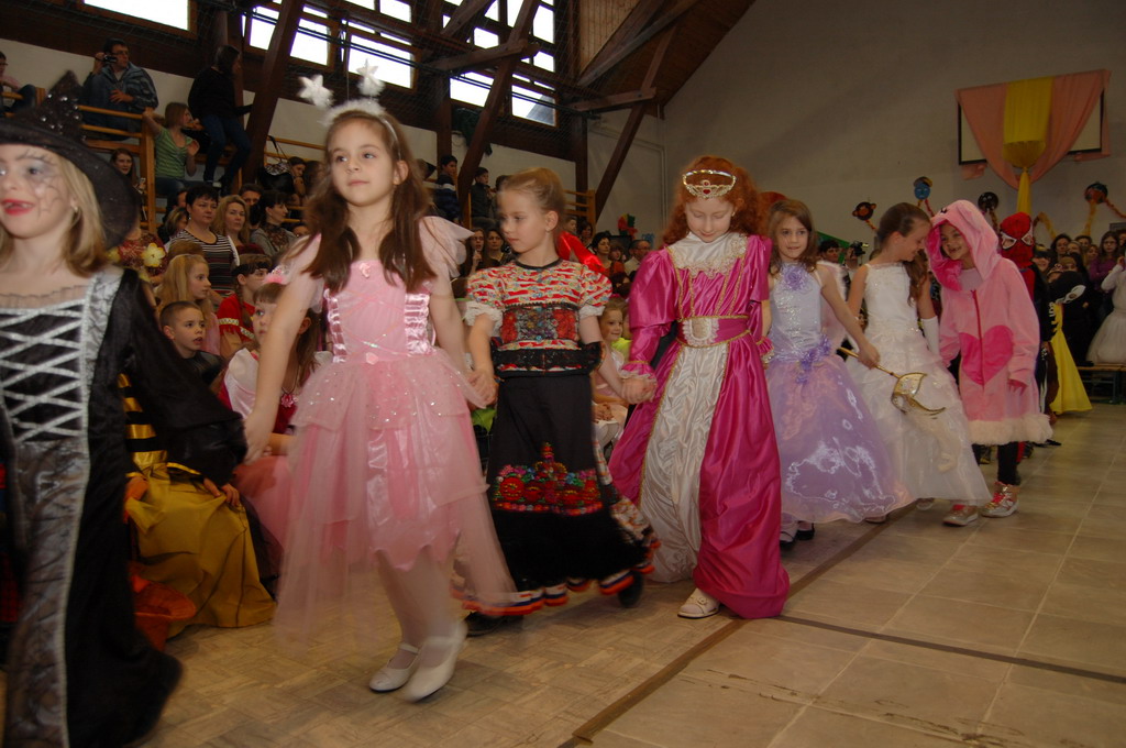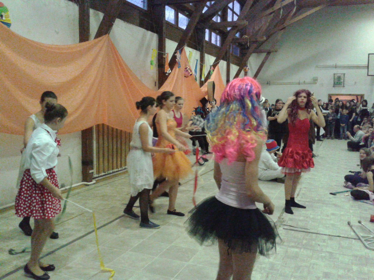 Az igazgató úr megnyitó beszéde után a 6. és 7. osztály társastáncosai gyönyörű ruhában angolkeringővel kezdték meg a szórakoztató jelmezes bemutatókat. Szinte minden felsős részt vett a vidám műsorban, melyben az osztályok jobbnál-jobb élménydús zenés jelenetet, paródiát, táncot, éneket adtak elő, a közönség (tanárok, szülők, kisdiákok) nem kis örömére. A farsangi karnevál első része társastáncosaink kör cha-chájával fejeződött be.